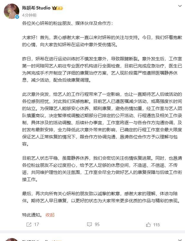 陈妍希受伤跟腱断裂,心疼😭真的破防了😭永远温柔努力的陈妍希,运动时意外导致跟腱断裂手术顺利完成,接下来就是漫长的康复之路明明一直认真自律,却遭遇突发伤病愿时光温柔以待,好好养伤,慢慢恢复我们不急,等你元气满满,再度归来💛