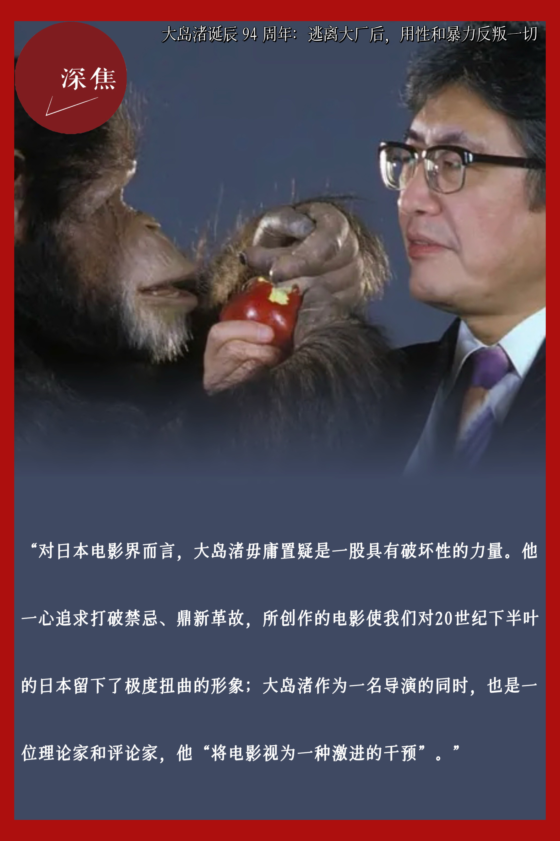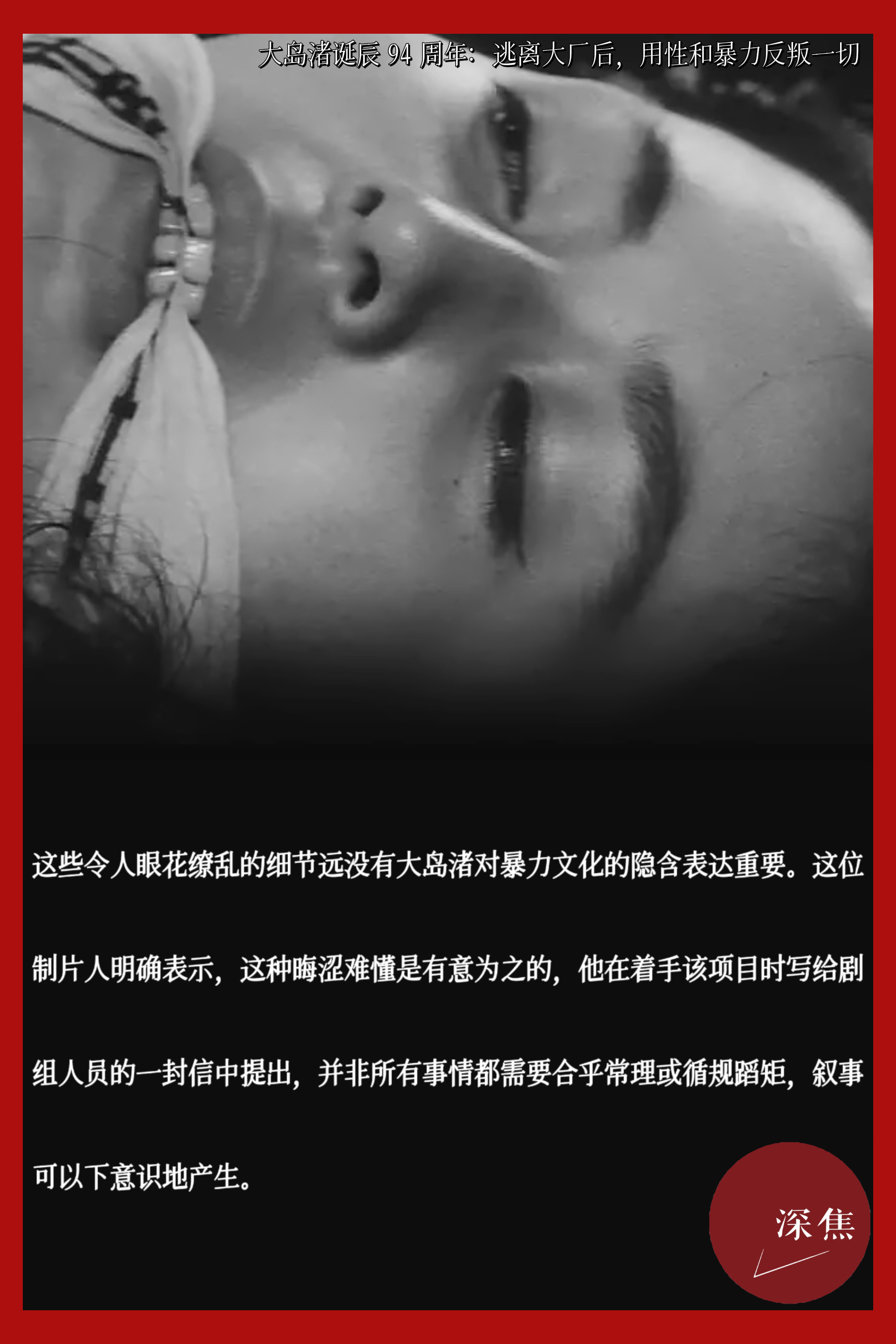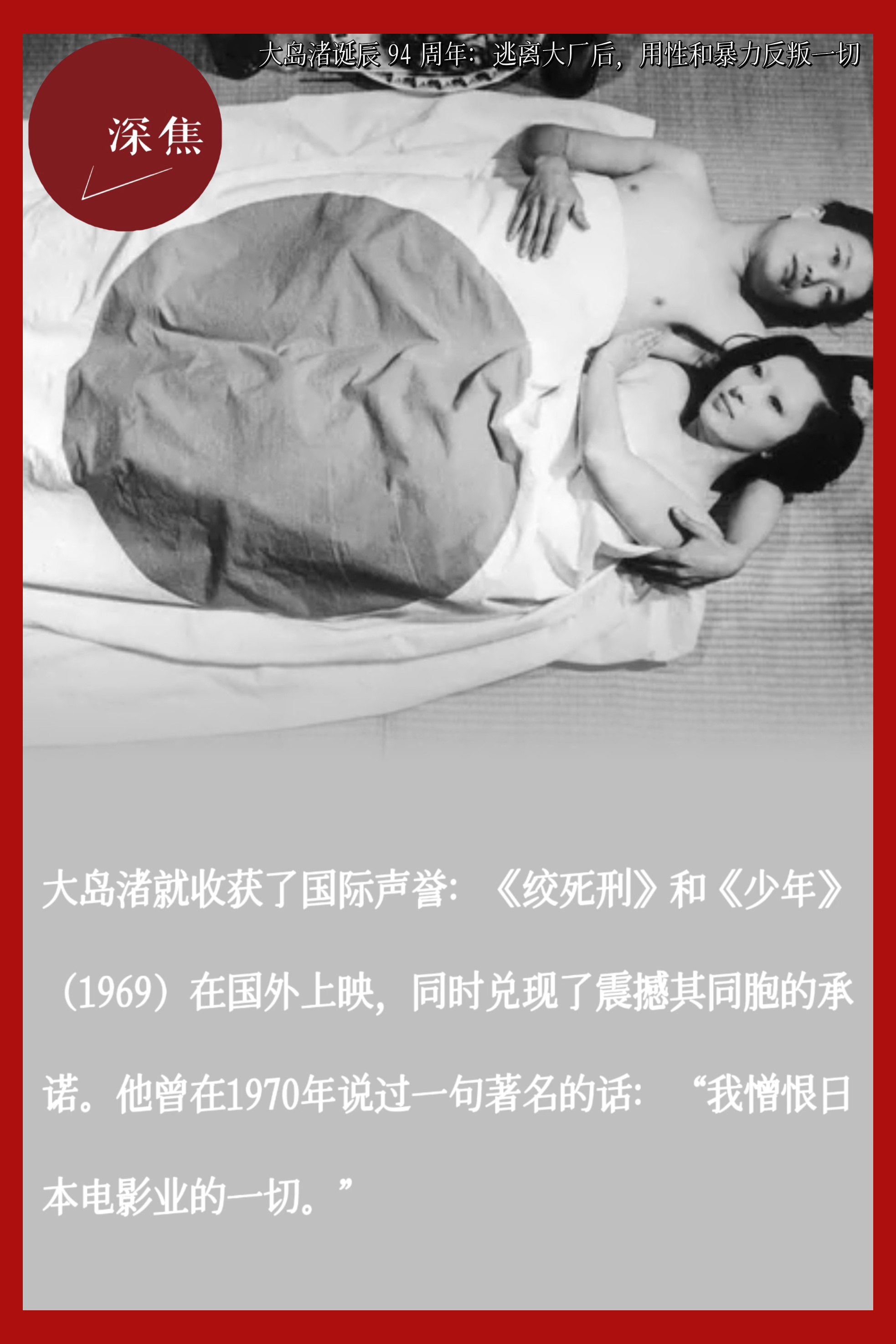 大岛渚诞辰94周年今天是大岛渚诞辰的94周年,他不仅是日本电影导演,还是一名理论家、评论家。被学界视为“一股具有破坏性的力量”,一生追求打破禁忌、鼎新革故。学者 Maureen Turim 称他“将电影视为一种激进的干预”。从1959年到1999年,40年职业生涯中始终是一个局外人。