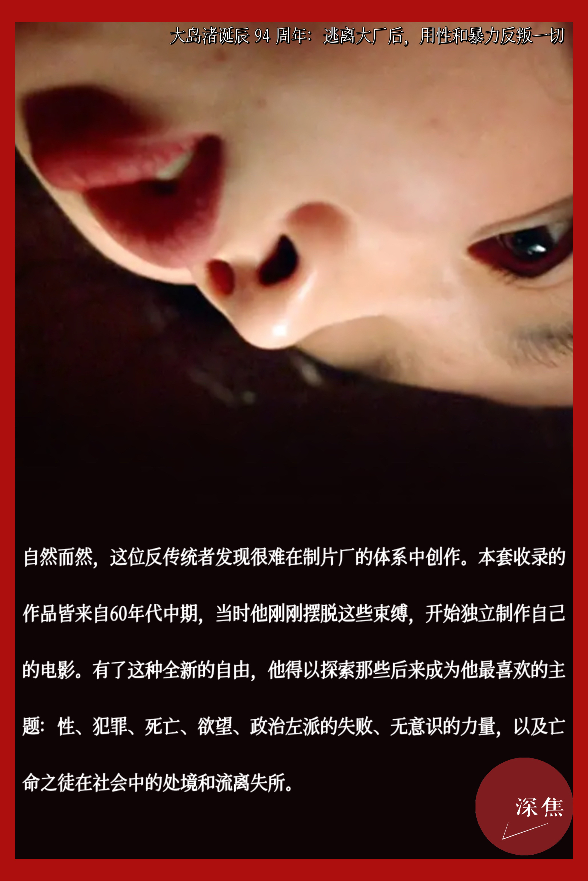 大岛渚用性和暴力作为武器,从制片厂体系出逃,终生反叛——他的电影让日本在20世纪下半叶的形象“极度扭曲”,却也成为日本电影史上最不可忽视的激进声音。