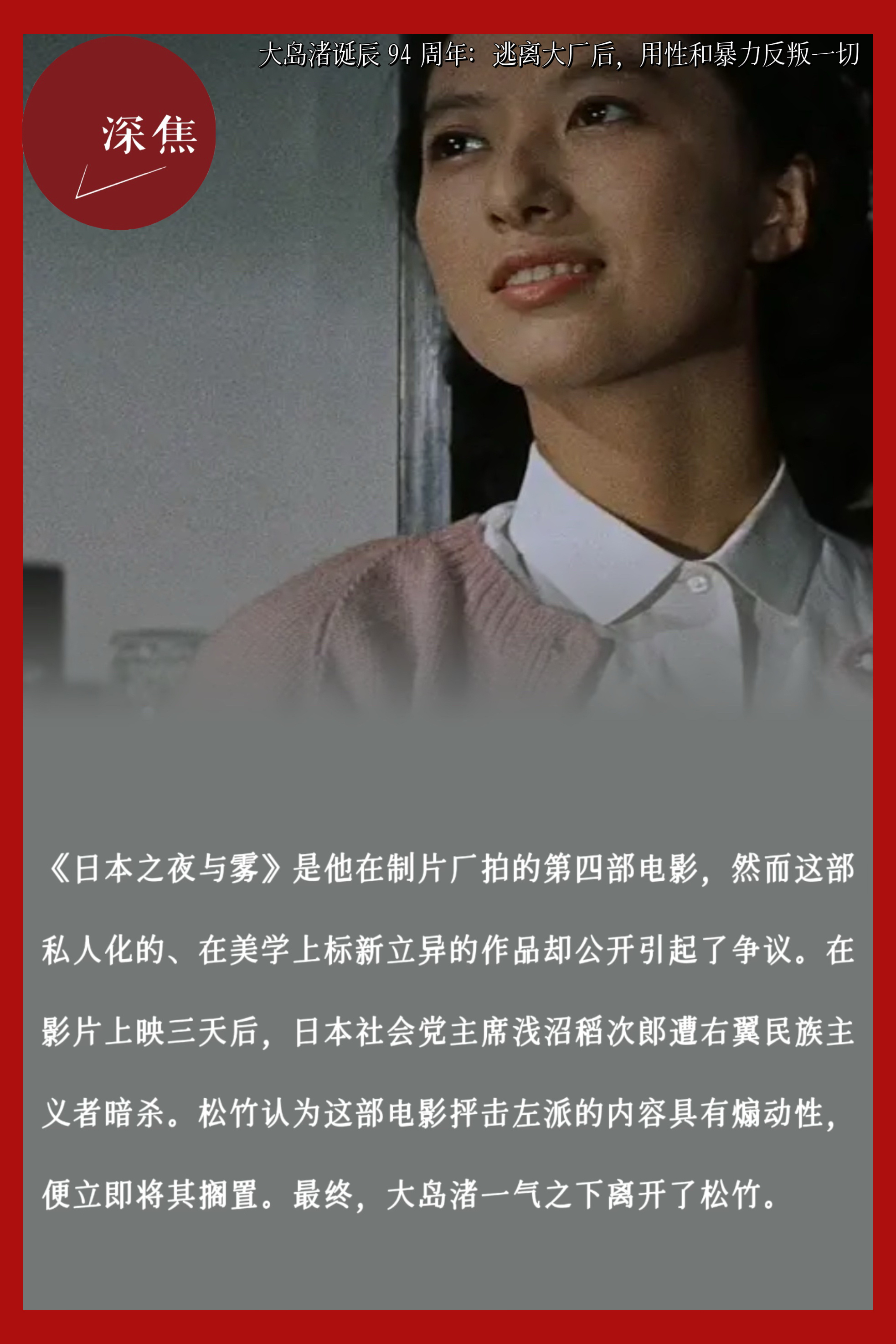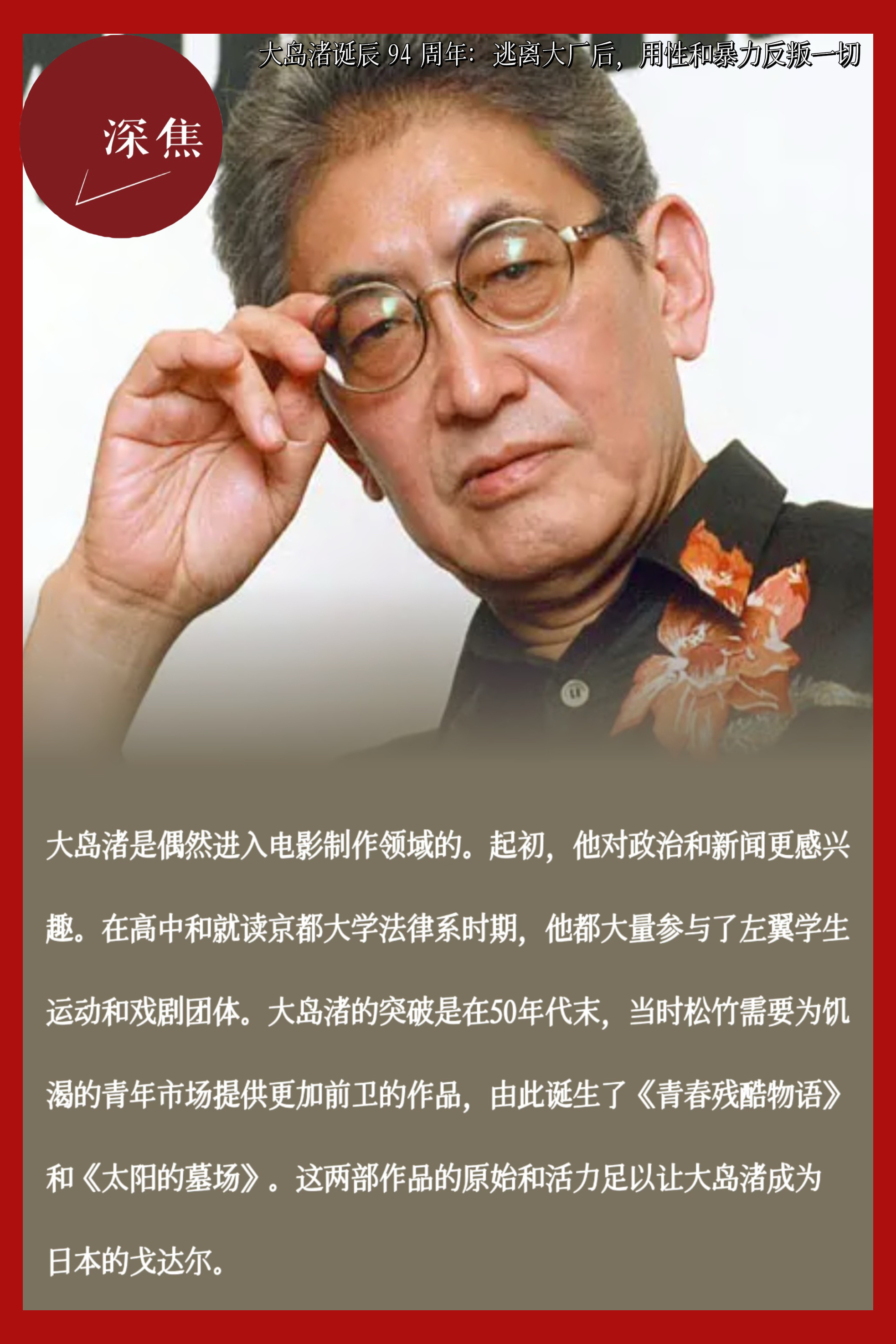 1954年进入松竹助理导演培训项目,自称“没有其他公司愿意雇用我,碰巧进了电影公司”;1950年代末为青年市场创作《青春残酷物语》《太阳的墓场》(1960),原始活力令其被称为“日本的戈达尔”;1960年第四部电影《日本之夜与雾》因涉及左派失败内容被松竹搁置,大岛渚一气之下离开制片厂,成为第一位离开大型制片厂并创建独立公司“创造社”(Sozo-sha)的日本导演