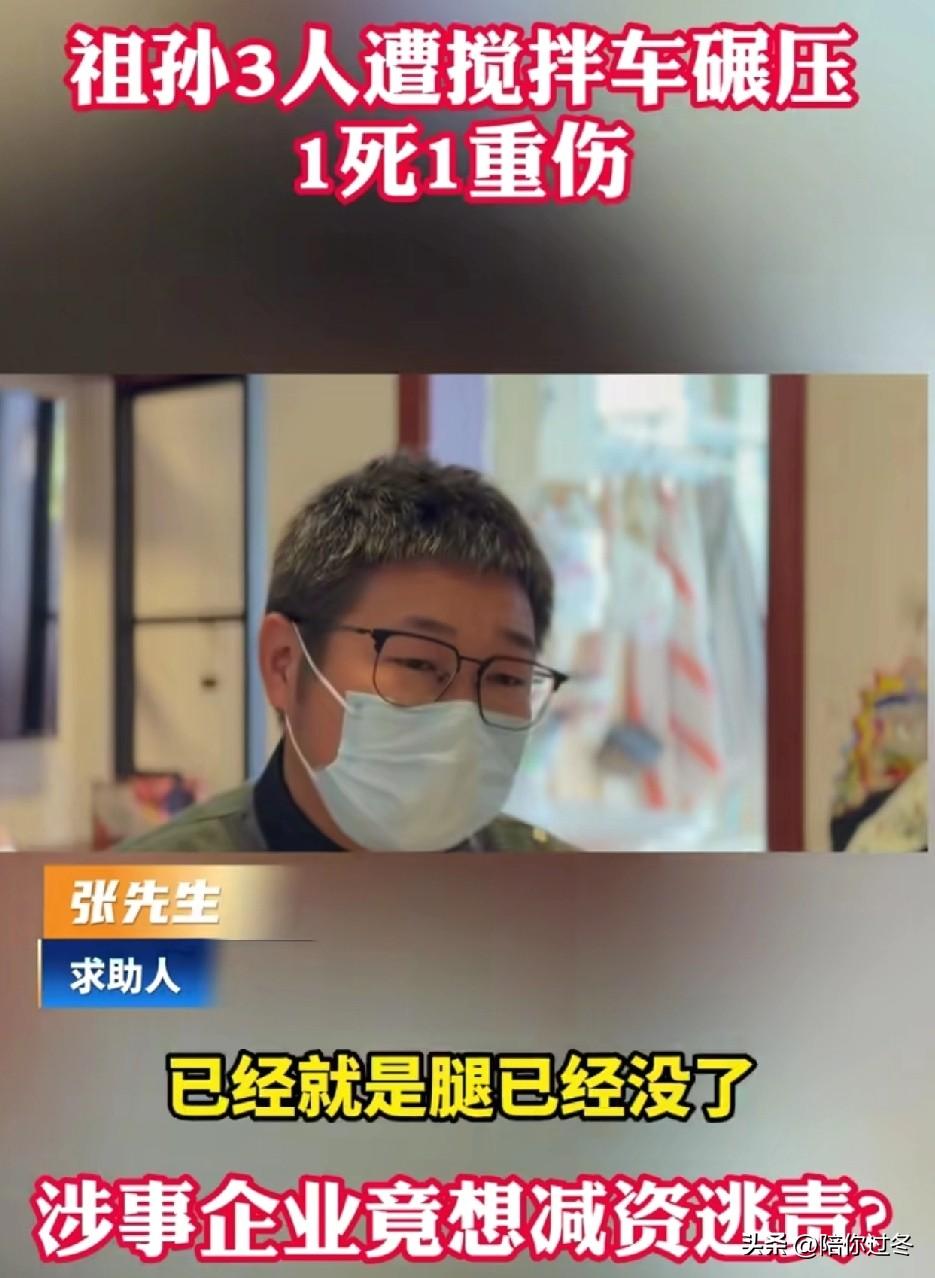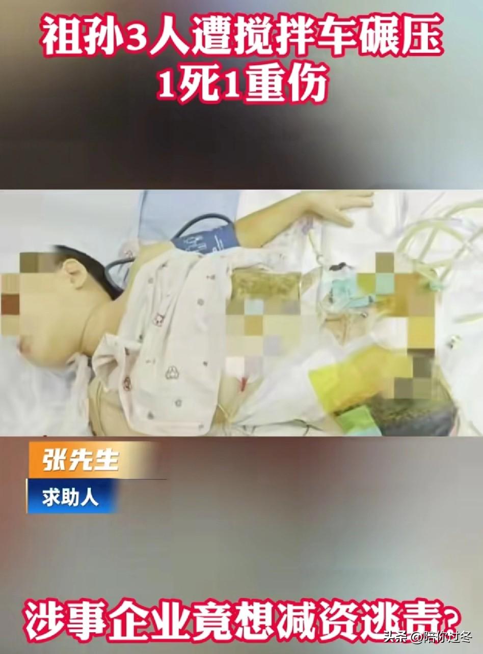 祖孙3人遭搅拌车碾压1死1重伤! 揪心呀!奶奶当场身亡,7岁的姐姐双腿高位截肢,一辈子也算毁了,而涉事方不闻不问,还篡改数据企图躲避赔偿,良心何在呀! 3月31日,据海报新闻报道,上海闵行区的张先生找到记者寻求帮助,他声称去年11月3日,其母亲骑电动车接两个女儿放学的时候遭到了搅拌车的碾压。 母亲当场身亡,7岁的大女儿受伤严重经过20多天的抢救,总算保住了性命,但是双腿已经高位截肢了,一辈子只能坐轮椅了,而6岁的小女儿还算幸运,只受了一些皮外伤。 更让人气愤的是截至到目前为止,涉事方都没有出现,也没有赔偿,所有的费用都是由张先生自己垫付,面对较高的手术费治疗费和康复费,自己已经无力承担了。 事故调查报告显示,搅拌车在右转弯的时候有违规行为,还严重超载了,所以搅拌车被判定为全责。此外交管部门还调查到此辆搅拌车在前一个月内已经连续多次超载。 目前,张先生已经向法院提起了诉讼,可万万没想到的是,就在立案后的第12天,涉事公司还玩起了“偷梁换柱”,把2000万的公司注册资金,偷偷的改成了50万,想以此减少赔偿。 像这种没有良心的公司必须严惩,还死者一个公道,该赔偿的钱一分也不能少,希望法律会作出公平公正的裁决。幼童遭车辗轧 儿童遭碾压