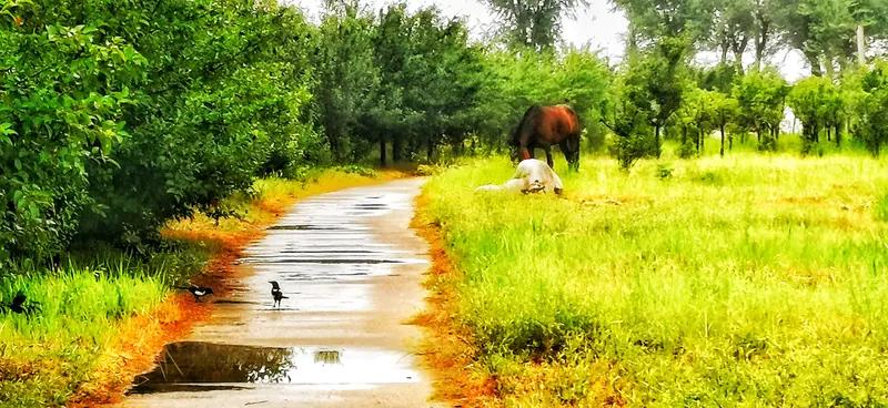 这首《七绝•郊野新晴》简直把雨后郊野之美写到我的心坎里了。“雨过郊原草木芳”,一场雨过后,郊野的草木都散发着芬芳,仅仅读着这一句,仿佛就能闻到那清新的气息。 “蜂蝶逐影绕篱墙”,极具画面感,蜜蜂和蝴蝶绕着篱墙飞舞,追逐着彼此的影子,好一派生机勃勃的景象。 末两句“凭栏尽览千重翠,坐听蛙声入晚凉”,让人仿若看到诗人凭栏远眺,满目翠绿,又在夜晚静静聆听蛙声,感受着丝丝凉意,意境十足。感觉置身于这样的环境中,身心都能得到极大的放松。