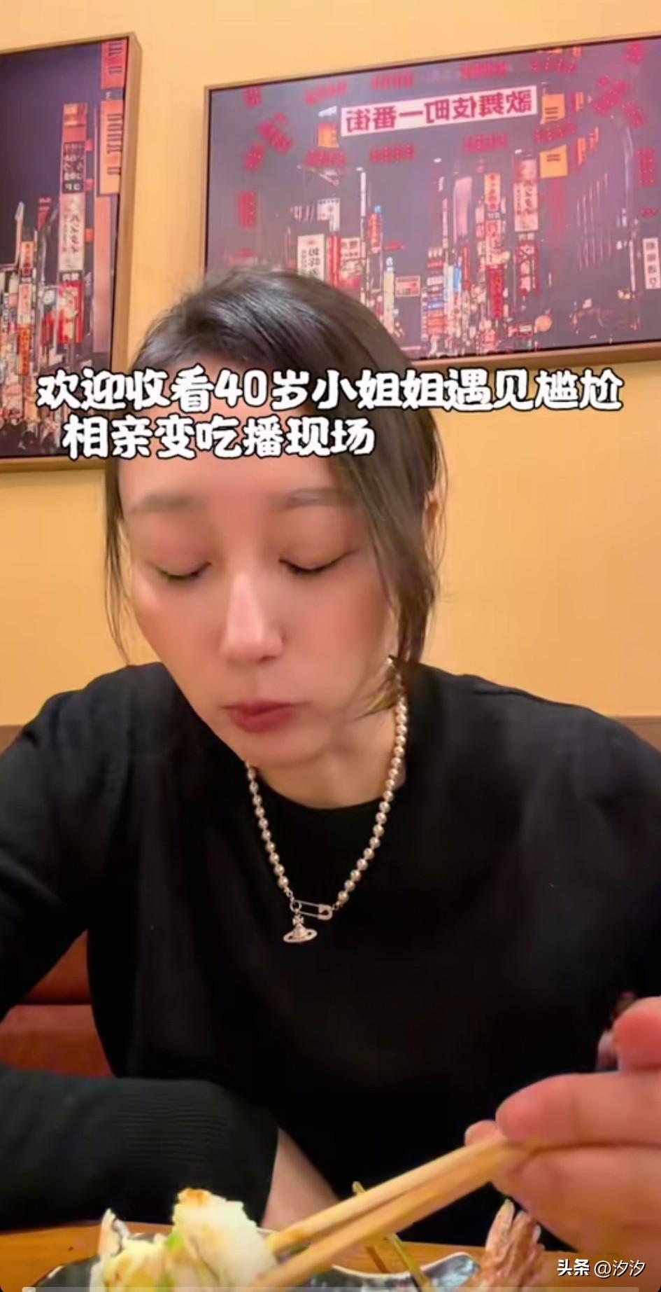 40岁的小姐姐, 被红娘安排上了相亲, 这次相亲的是83年的男生, 而且这名男生也非常的帅气, 要求也非常的高, 姑娘觉得两个人特别合适, 于是就安排了两个人进行相亲, 这次她们来到了一个日式饭馆, 一开始聊的还不错, 男生一直在给他夹菜, 不过后来 两个人发现双方不是自己需要的那个人,场面一度变得很尴尬, 相亲现场秒变吃播现场, 更搞笑的是服务员一直在旁边不离开, 就是为了 听他们的八卦, 这名小姐姐发现了服务员的意图, 不过她也不介意了, 毕竟做博主的脸皮都厚, 这点事儿反正也会被粉丝看见, 她也不在乎了, 结果她把相亲变吃播的故事放上了网, 粉丝没有涨多少? 反而是她多年不联系的老姐妹, 纷纷来联系她请他吃饭, 这让她开启了吐槽模式, 觉得自己这么优秀, 就算找不到对象,也不需要别人怜悯, 还说自己要活出自己的精彩, 大家觉得这样40多岁的大龄优质女还能找到真爱吗? 40岁的大龄剩女还能找到真爱吗?