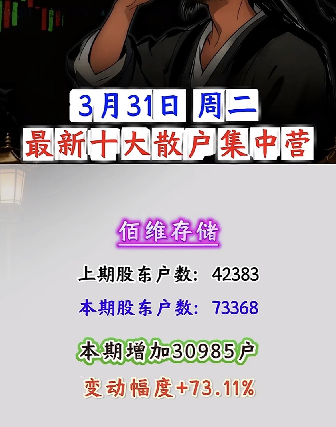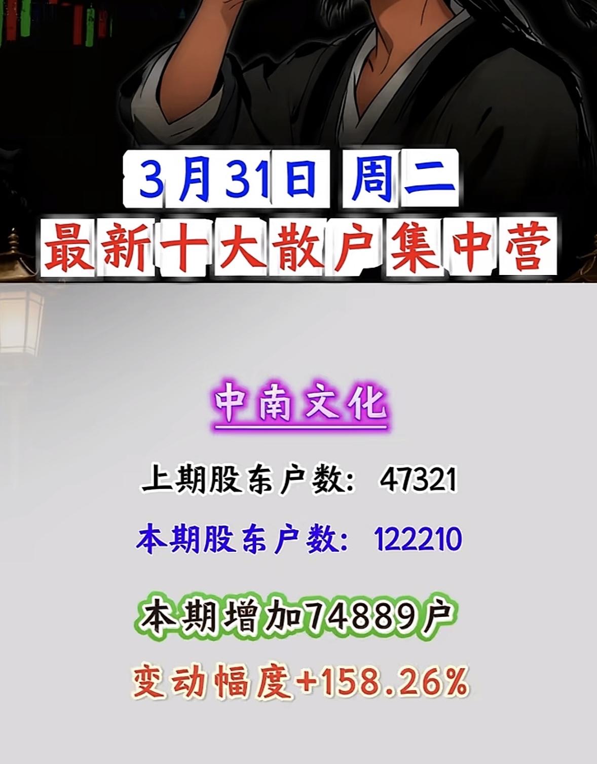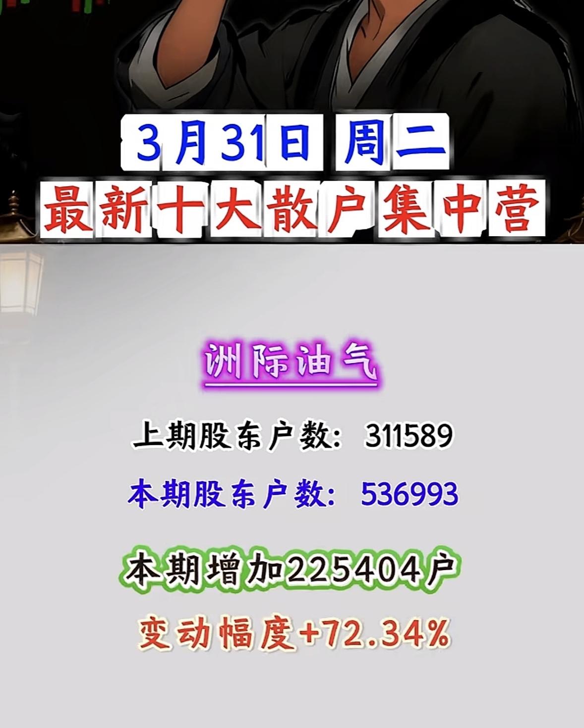 3月31日散户“集结号”吹响!这些股户数暴增超100%,是机会还是陷阱? 3月31日周二,A股散户动向曝光!十大散户集中营名单出炉,户数暴增背后,是资金抱团还是风险预警?一文看懂核心数据与逻辑! 户数暴增王:浙文互联、中南文化领衔,散户“扎堆”进场 - 浙文互联:户数从84952激增至262114,暴增117162户,变动幅度+208.54%!散户关注度断层领先,或与AI营销、文化传媒板块热度相关,但需警惕筹码分散后的抛压风险。 - 中南文化:户数从47321增至122210,增加74889户,变动+158.26%。文化娱乐板块近期活跃,散户跟风迹象明显,短期波动或加剧。 科技+能源:佰维存储、洲际油气户数大增,赛道热度分化 - 佰维存储:存储芯片概念热度延续,户数从42383增至73368,增加30985户,变动+73.11%。AI算力需求驱动下,存储板块仍是资金关注焦点,但散户集中度提升或影响后续拉升力度。 - 洲际油气:能源板块户数从311589增至536993,暴增225404户,变动+72.34%。国际油价波动叠加地缘政治因素,散户“抄底”情绪浓厚,但需警惕油价回调风险。 其他热门股:豫能控股、剑桥科技等户数显著增长 - 豫能控股:电力板块户数增加29280,变动+52.60%;剑桥科技:CPO概念户数增加40766,变动+48.64%;法尔胜:超导概念户数增加21925,变动+39.29%。科技、能源、基建板块散户关注度普遍提升,但需结合基本面判断持续性。 散户集中营:是“机会”还是“风险”? 散户户数暴增通常意味着: - 短期热度:资金关注度提升,股价或有脉冲式上涨; - 筹码分散:后续拉升需更多资金承接,若主力资金未跟进,易引发回调; - 情绪博弈:散户扎堆股往往波动剧烈,需警惕“追高被套”风险。 投资建议:关注浙文互联、中南文化等户数暴增股的板块联动性,同时警惕佰维存储、洲际油气的回调压力。散户集中≠股价必涨,理性分析基本面与资金流向,才是制胜关键! 风险提示:以上数据基于公开信息整理,不构成投资建议。股市有风险,入市需谨慎。