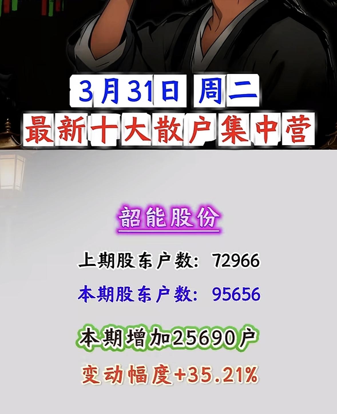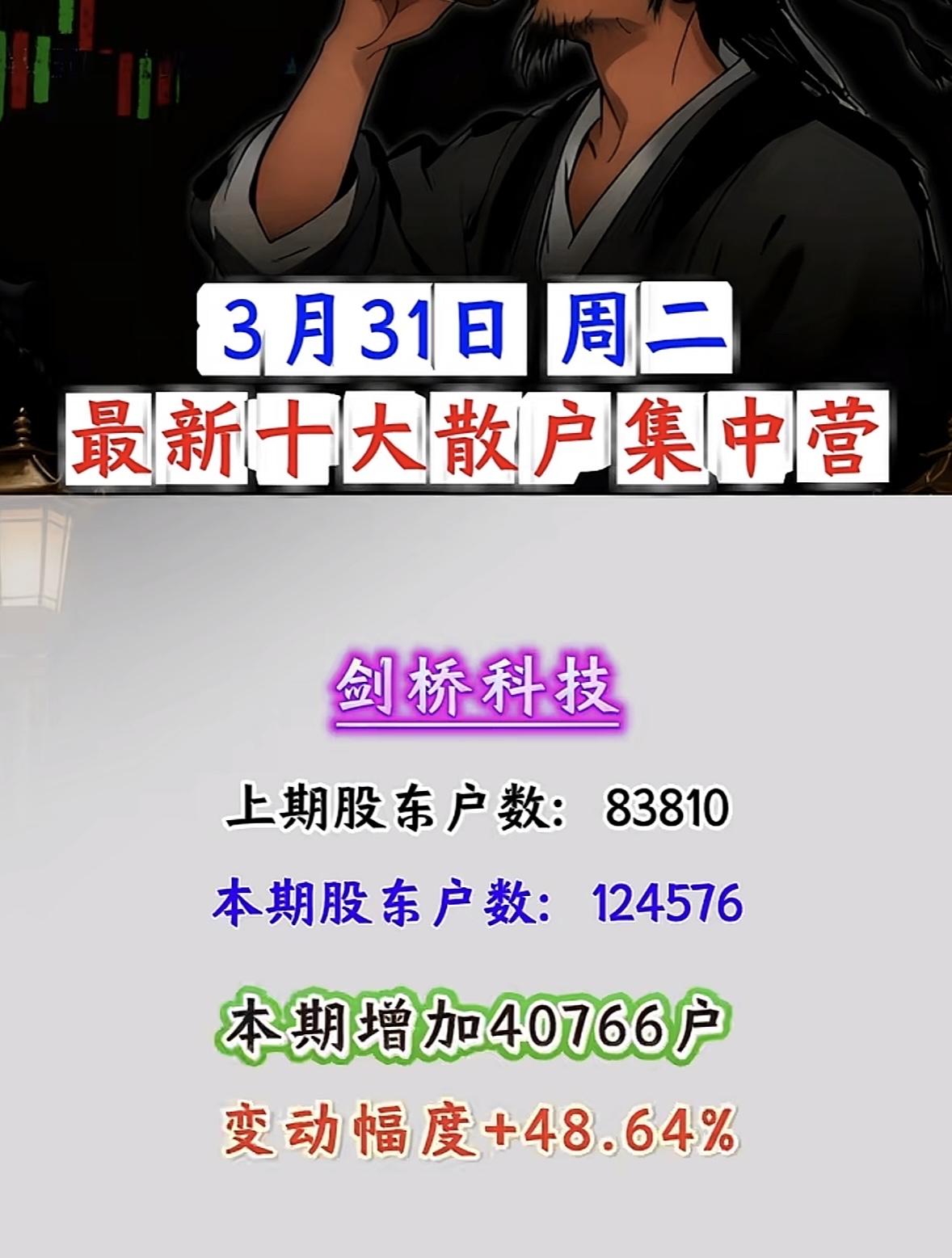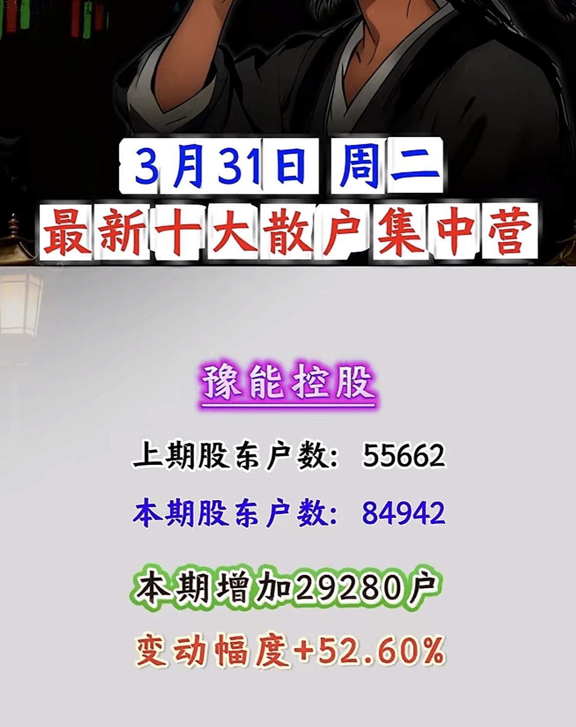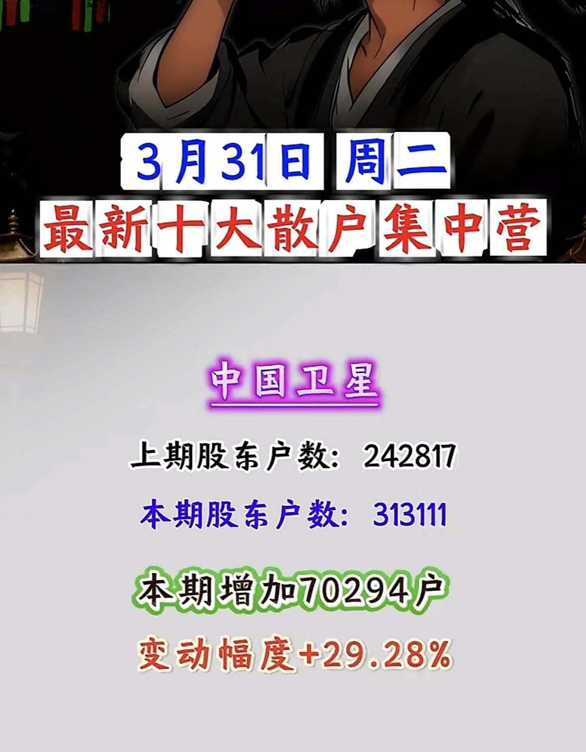 3月31日散户“集结号”吹响!这些股户数暴增超100%,是机会还是陷阱? 3月31日周二,A股散户动向曝光!十大散户集中营名单出炉,户数暴增背后,是资金抱团还是风险预警?一文看懂核心数据与逻辑! 户数暴增王:浙文互联、中南文化领衔,散户“扎堆”进场 - 浙文互联:户数从84952激增至262114,暴增117162户,变动幅度+208.54%!散户关注度断层领先,或与AI营销、文化传媒板块热度相关,但需警惕筹码分散后的抛压风险。 - 中南文化:户数从47321增至122210,增加74889户,变动+158.26%。文化娱乐板块近期活跃,散户跟风迹象明显,短期波动或加剧。 科技+能源:佰维存储、洲际油气户数大增,赛道热度分化 - 佰维存储:存储芯片概念热度延续,户数从42383增至73368,增加30985户,变动+73.11%。AI算力需求驱动下,存储板块仍是资金关注焦点,但散户集中度提升或影响后续拉升力度。 - 洲际油气:能源板块户数从311589增至536993,暴增225404户,变动+72.34%。国际油价波动叠加地缘政治因素,散户“抄底”情绪浓厚,但需警惕油价回调风险。 其他热门股:豫能控股、剑桥科技等户数显著增长 - 豫能控股:电力板块户数增加29280,变动+52.60%;剑桥科技:CPO概念户数增加40766,变动+48.64%;法尔胜:超导概念户数增加21925,变动+39.29%。科技、能源、基建板块散户关注度普遍提升,但需结合基本面判断持续性。 散户集中营:是“机会”还是“风险”? 散户户数暴增通常意味着: - 短期热度:资金关注度提升,股价或有脉冲式上涨; - 筹码分散:后续拉升需更多资金承接,若主力资金未跟进,易引发回调; - 情绪博弈:散户扎堆股往往波动剧烈,需警惕“追高被套”风险。 投资建议:关注浙文互联、中南文化等户数暴增股的板块联动性,同时警惕佰维存储、洲际油气的回调压力。散户集中≠股价必涨,理性分析基本面与资金流向,才是制胜关键! 风险提示:以上数据基于公开信息整理,不构成投资建议。股市有风险,入市需谨慎。