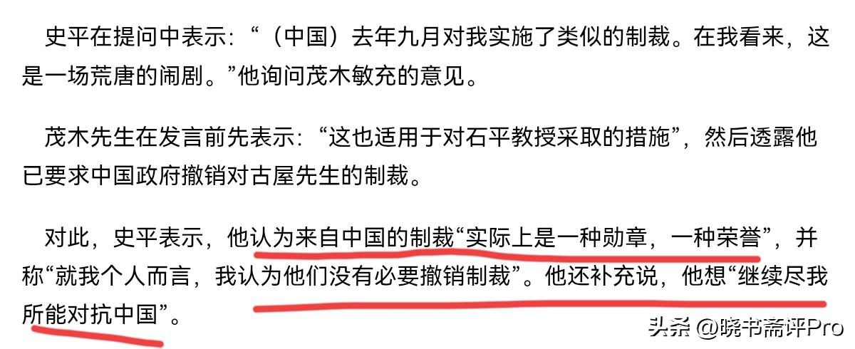 汉奸石平跳出来为被我们制裁的古屋圭司撑腰了!3月31日,石平放话声称,中国去年九月对我实施了类似的制裁。在我看来,这是一场“荒唐的闹剧”。来自中国的制裁“实际上是一种勋章,一种荣誉”,就我个人而言,我认为他们没有必要撤销制裁”,并将继续尽我所能对抗中国。