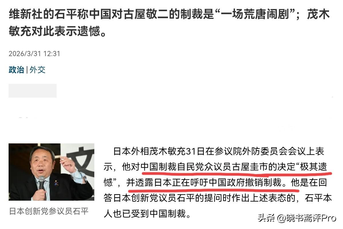 日本出来回应了!在我们制裁日本国会众议员古屋圭司之后,日本出来回应了!3月31日,日本外相茂木敏充31日在参议院外防委员会会议上表示,他对中国制裁自民党众议员古屋圭司的决定“极其遗憾”,并透露日本正在呼吁中国政府撤销制裁。对于日本的回应,我们怎么看呢?