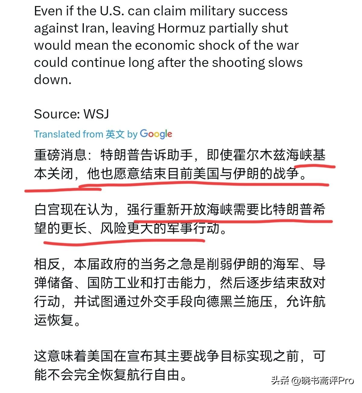 当然,所谓本届政府的直接目标是削弱伊朗的海军、导弹储备、国防工业和打击能力,这不过是美国提桶跑路前给自己找的体面借口而已。显然,贸然发动战争之后,美国害怕了,美国心里面很清楚,跟伊朗继续打下去,打不赢,耗不起,甚至自己的军事神话也会越来越被破灭。显然,时至今日,意欲潦草收场的美国,也难以维持自己的体面了。