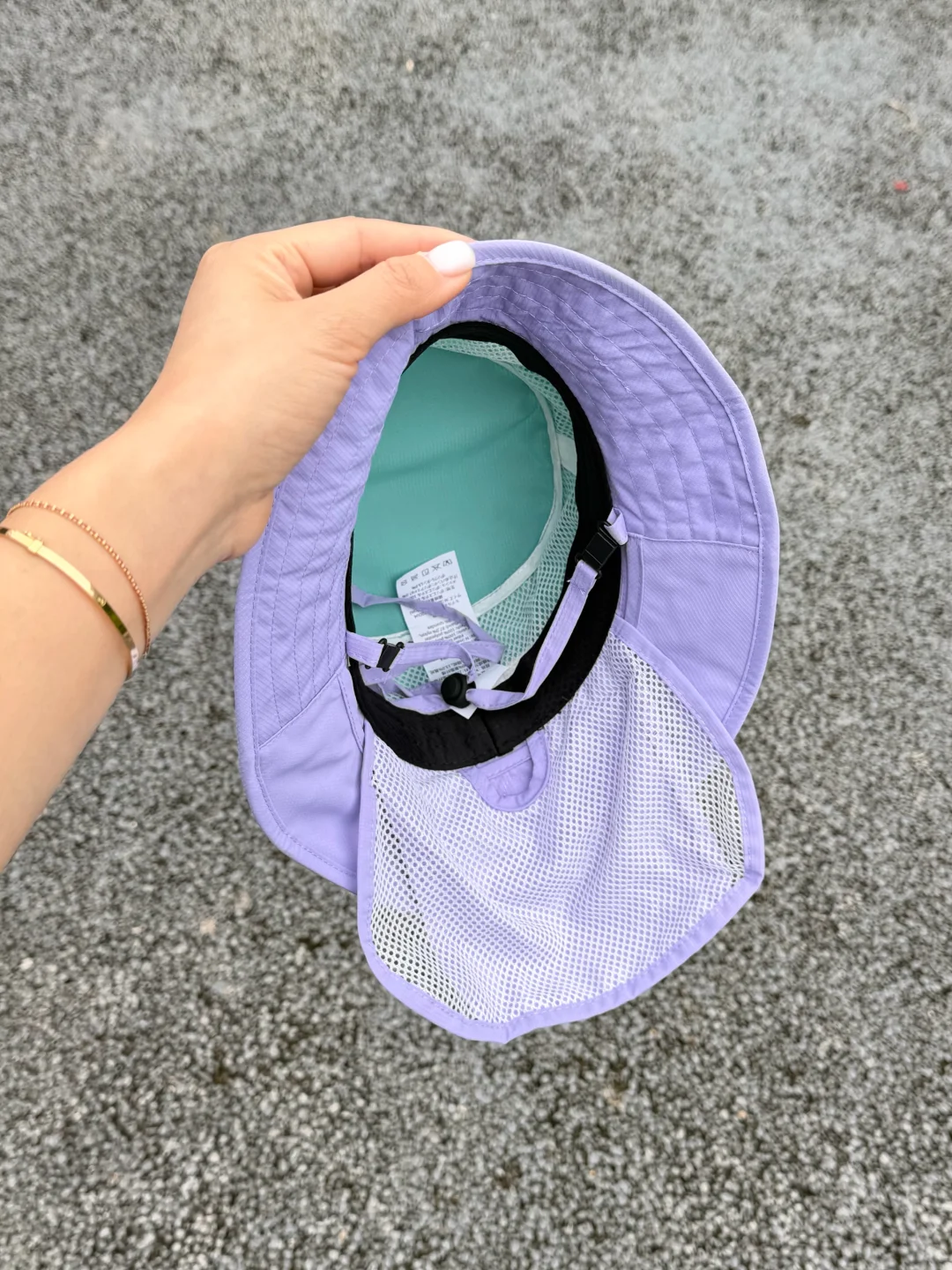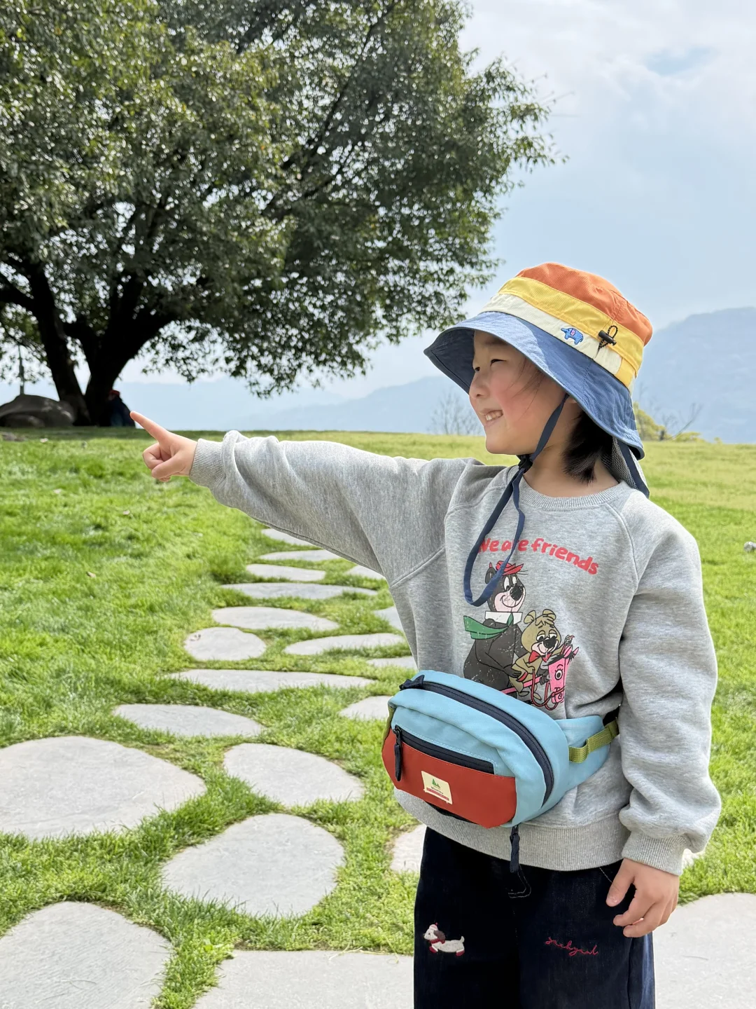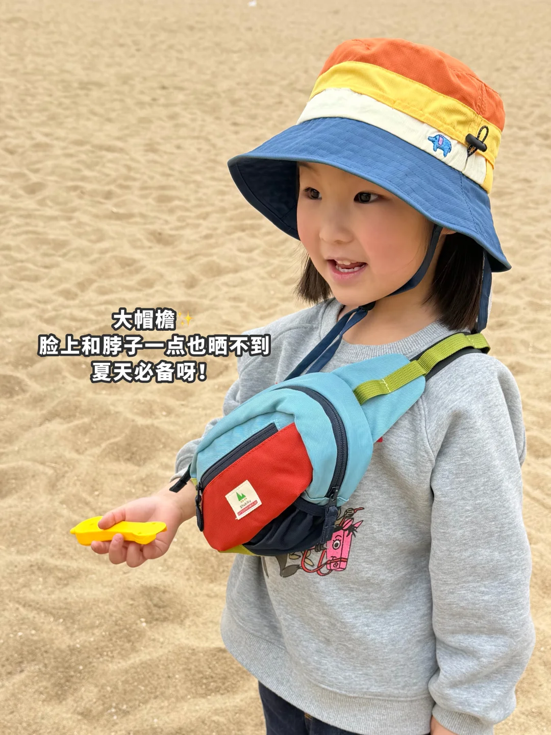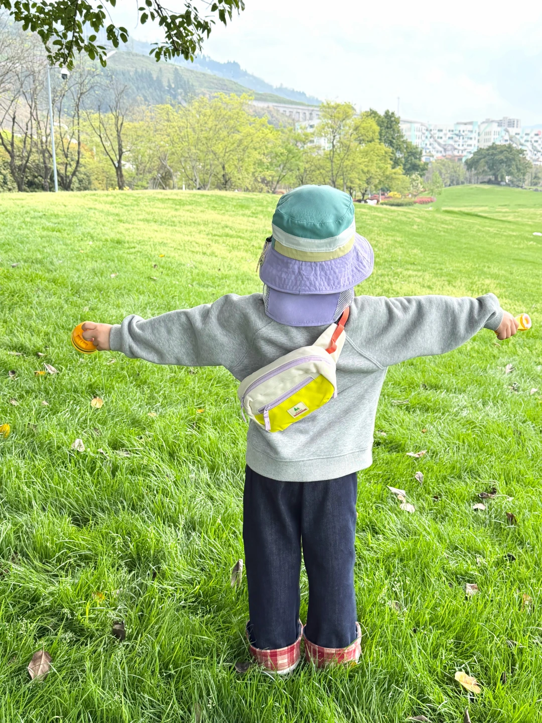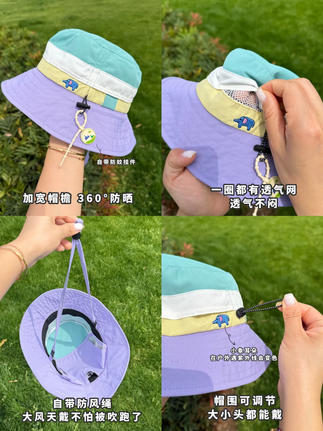 蓝紫小象防晒渔夫帽和香草柠檬胸包的配色