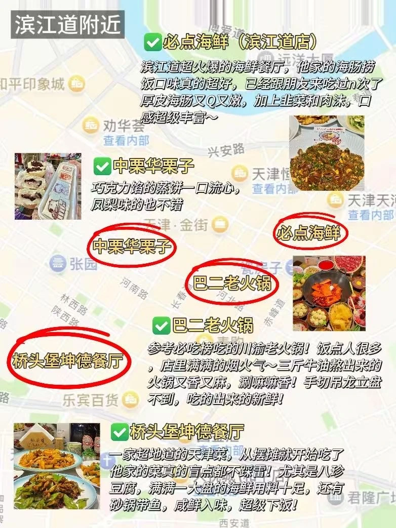 📍滨江道:必点海鲜(滨江道店)、桥头堡坤德餐厅、巴二老火锅、中栗华栗子