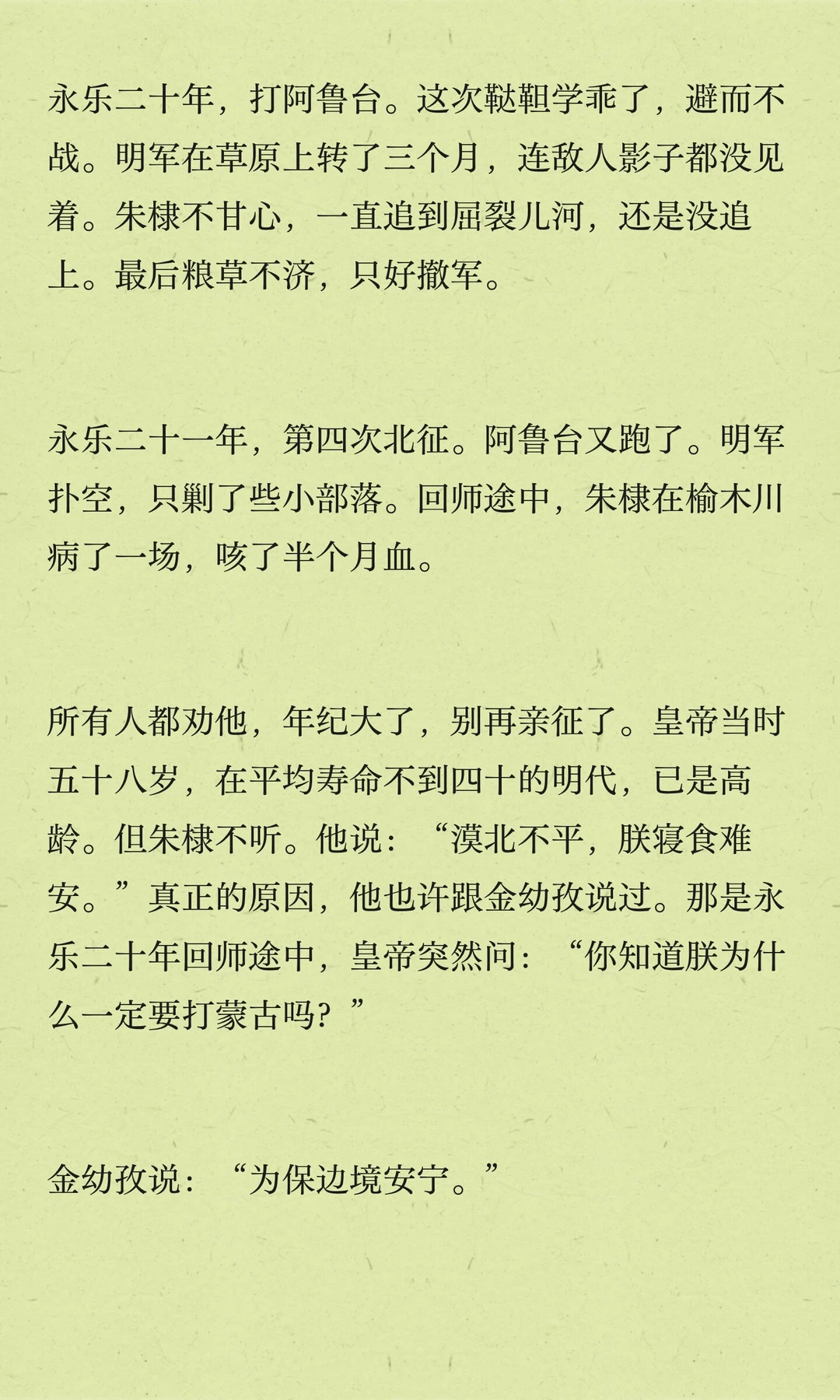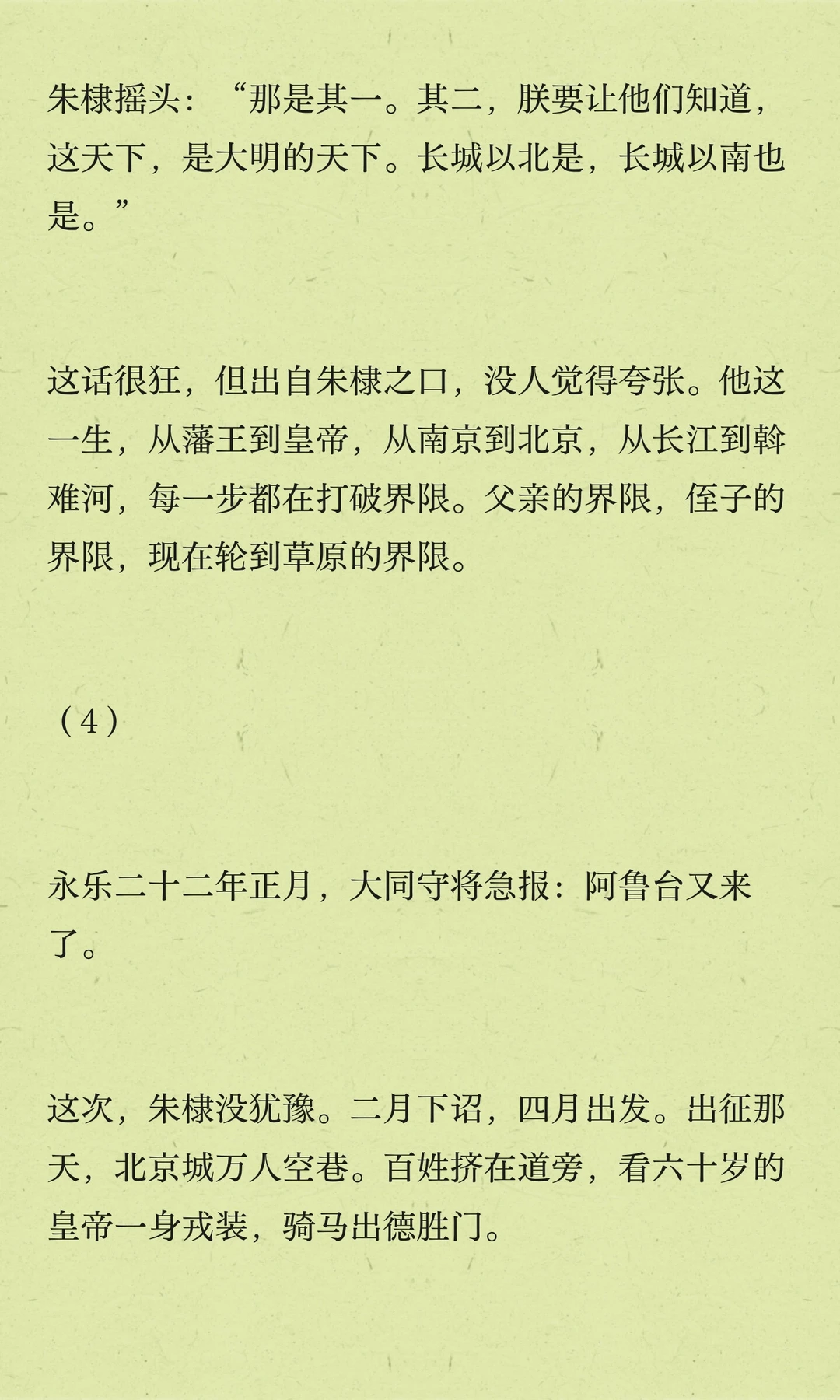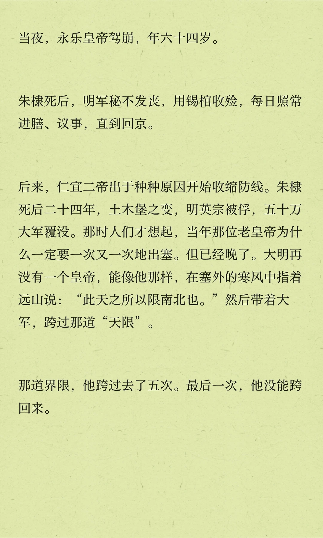 朱棣五次北征,巩固边防,树立大明威信。他深知长城以北是大明疆域,决心打破草原界限,展现大明实力。最后一次北征,他却未能再回。