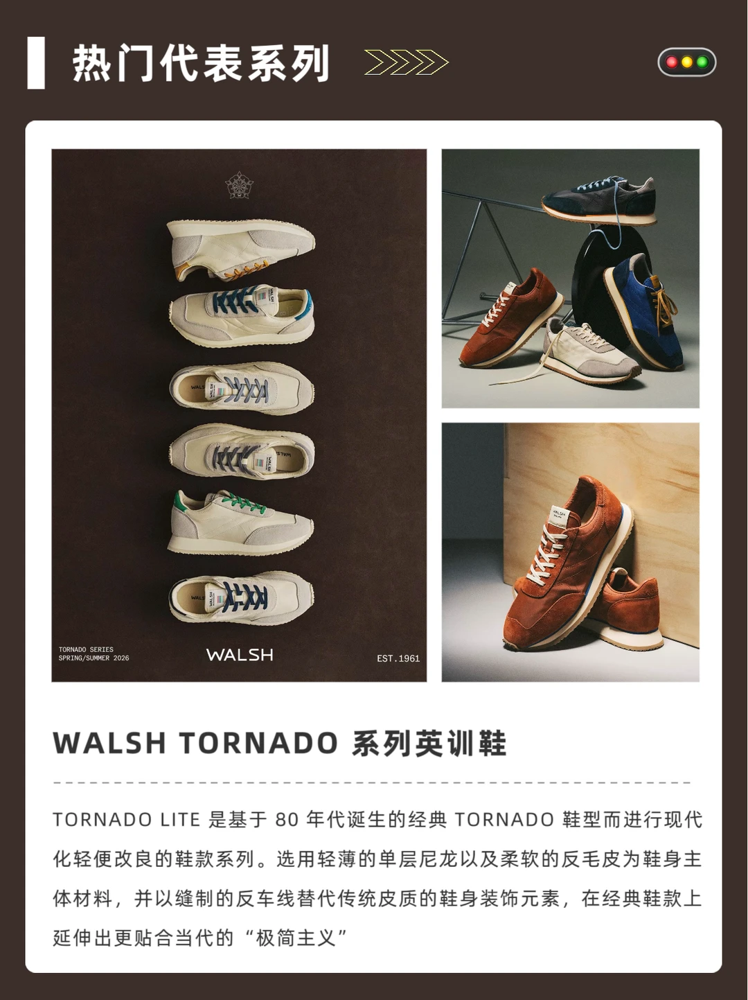 🔹 TORNADO / TORNADO LITE系列:承袭80年代马拉松鞋型,轻灵复古,脚感轻盈