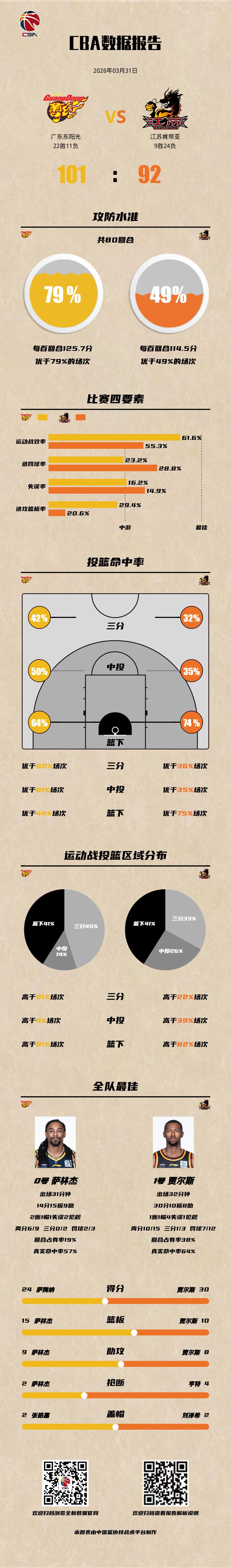 广东东阳光 101-92 江苏肯帝亚 广东男篮vs江苏男篮 广东东阳光:萨姆纳24分,徐杰19分3篮板5助攻,萨林杰14分15篮板9助攻2抢断; 江苏肯帝亚:贾尔斯30分10篮板8助攻,庞峥麟20分4篮板,亨特17分4篮板7助攻4抢断。以城之名