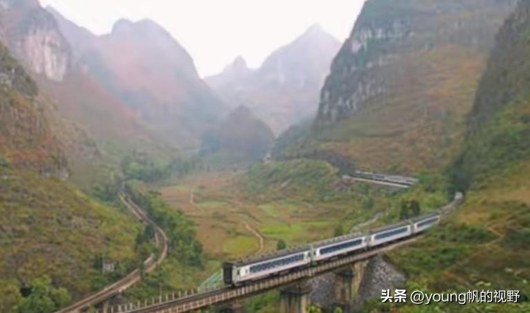 当年的老黔桂铁路,堪称是铁路史上的一绝。这条铁路虽然是沟通贵州与广西两省的重要通道,但由于修建在战争年代,也是一条标准特别低的铁路。受制于广西与贵州之间的层层大山阻隔,当年的筑路人充分的发挥了自己的智慧。通过将铁路在大山之中蜿蜒,使用展线的方式,实现了列车在大山之中的穿行。虽然行车速度很慢,但至少把两省之间用铁道联系起来了。其中比较经典有代表性的就是这条回笼道。周围的石峰与山脚下的列车形成了一幅美妙的画卷。随着新黔桂铁路的通车,老线很多地方也都废弃了。原来回笼道的铁轨也已经拆除,部分路基改造成了乡村公路。这些曾经的铁路历史遗迹,未来甚至可能就这样消失在大自然之中。