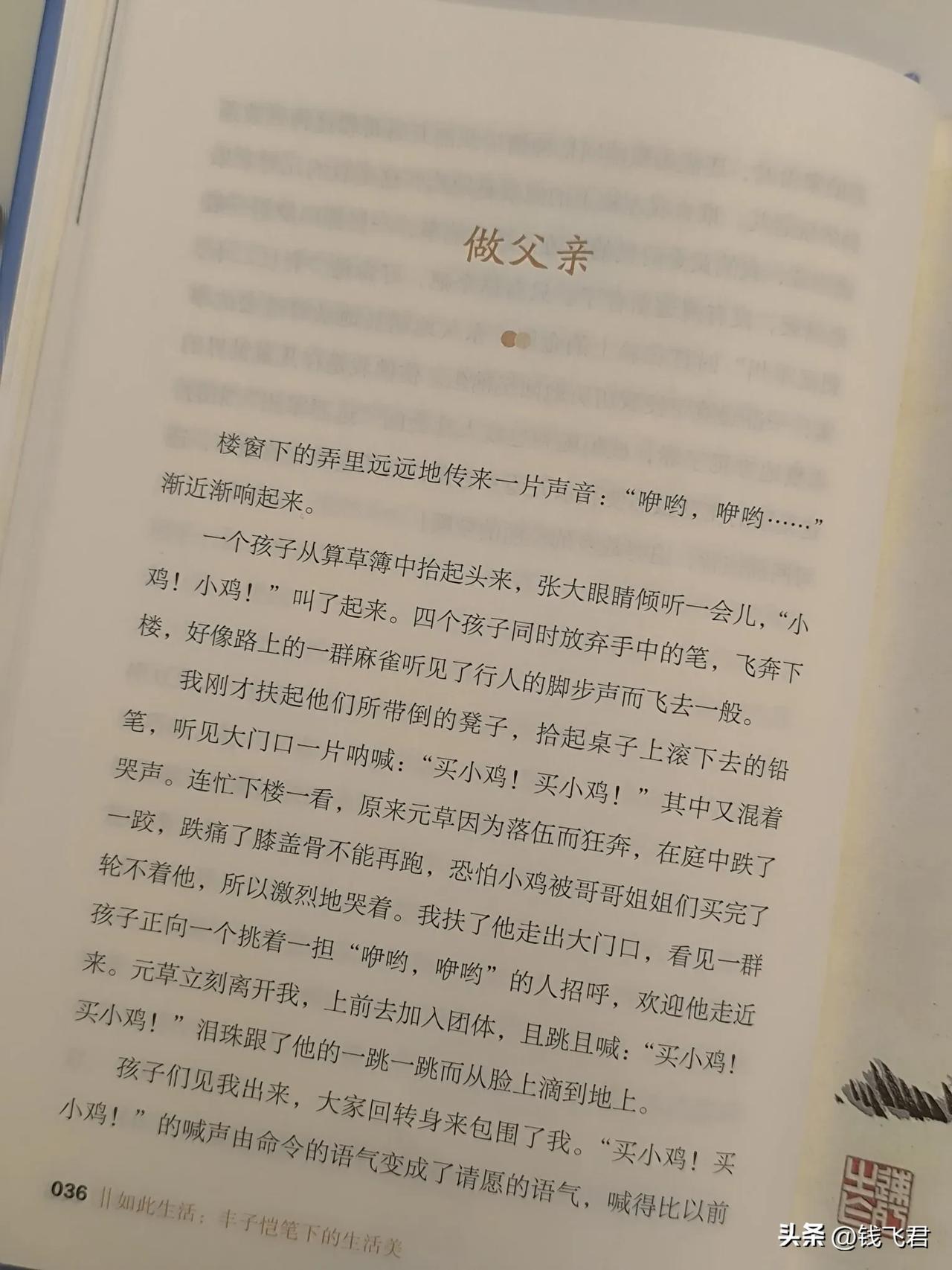 读他写的《做父亲》,让人联想育儿的真谛。若孩子喜欢某样东西要买,比如文章中买小鸡,做父亲哪有不满足的道理,但只因1元4只小鸡太贵,父亲没有买,便关门给孩子讲道理并延迟满足。