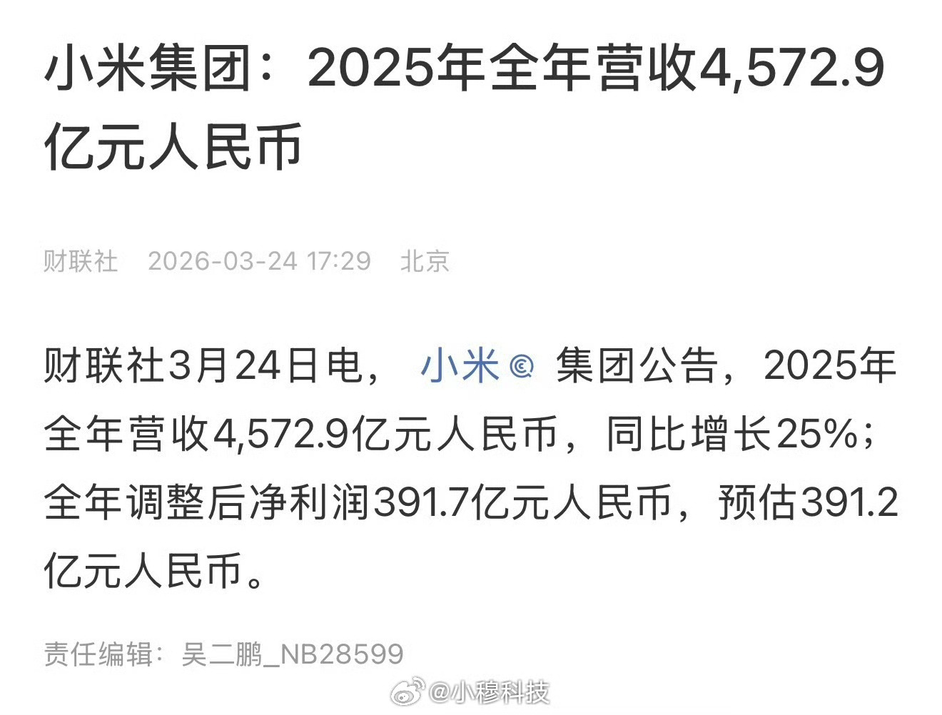 小米2025年财报,25年小米营收4573亿,净利润392亿,净利润率8.6%