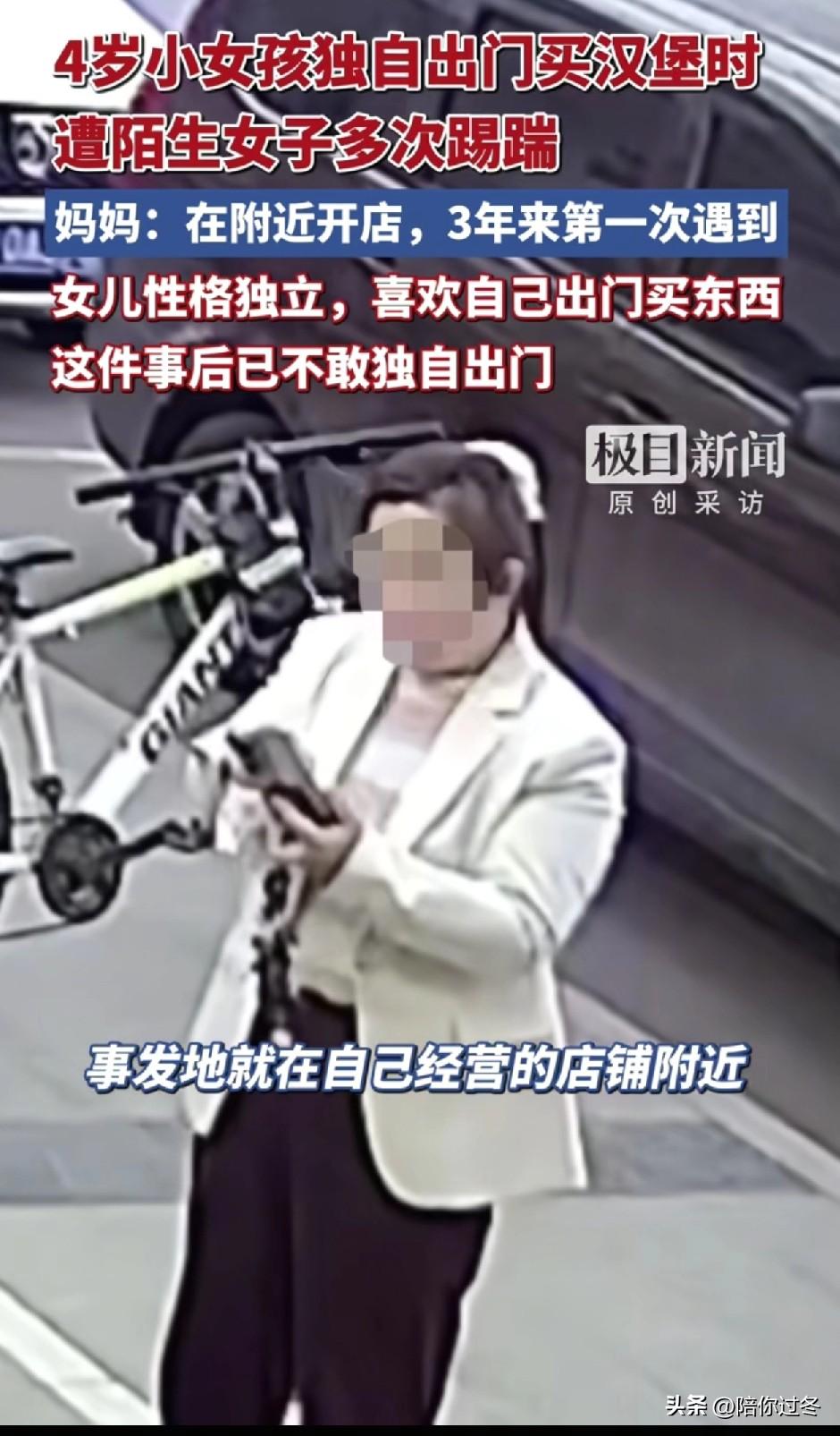 4岁女孩买汉堡,被陌生女子多次踢踹! 这下出名了全网都知道啦!这个女人太坏了,对一个4岁小女孩下手,你的良心不会痛吗? 3月31日,据极目新闻报道,女孩的妈妈邱女士告诉记者,自己在汉堡店附近也是开店做生意的,已经有好几年了,从来没有遇到过这种事。 她透露女儿4岁很独立,对这附近也很熟悉,经常一个人到汉堡店买东西吃,所以自己很放心没有觉得不妥,没想到这次却被陌生女子恶意踢踹很气愤! 视频中可以看到,孩子跪站在吧台的凳子上等待汉堡,没想到店里一位白色女子出现在孩子身后,无缘无故踢了孩子一脚,当准备踢第二脚的时候,老板出现了,她就把脚收了回来。 没想到的是,老板刚进去陌生女子又用脚狠狠踢了孩子的屁股。孩子被吓得哭着跑回家,还说道那个人很凶,孩子被吓得不轻,都有心理阴影了,现在都不敢一个人出门。 目前,气愤的邱女士已经带着监控视频报警了,相信很快就会有结果了,看年纪应该也不小了,难道自己就没有小孩吗,竟然对4岁小孩下手,真是让人无语呀!