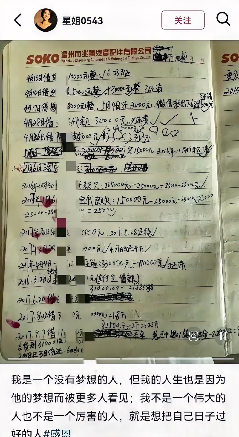 不得不佩服张雪的老婆星姐! 张雪2013年创业,启动资金只有2万块,为了维持运转,后来只能不断向亲友借,甚至还向平台借,少的几千,多的几十万,最穷的时候两人连20块的饭钱都凑不够,甚至窘迫到要靠卖旧机油换钱买面吃。 换作一些人,日子过得这么糟糕,吃不饱穿不暖,还要经常要厚着脸皮伸手问亲友借钱,压力山大,可能早就撑不下去,分道扬镳了。 可是星姐全程陪着张雪住出租屋、啃馒头,毫无怨言,认真地记录着每一笔债,然后一笔一笔地按时还。 创业前五年是最难熬的阶段,两人欠下的外债累计近百万,星姐的账本记了满满三本,每一笔还款日期、金额都标注得清清楚楚,从没逾期过一次。 为了多赚点钱还债,星姐白天帮着张雪打理创业杂事,晚上还接手工活补贴家用,每天只睡不到5个小时,从没喊过累。 身边不少亲友都劝星姐别再苦熬,趁着年轻重新选择,可她始终坚定地守在张雪身边,坚信创业终会有起色。 熬过七年低谷期,张雪的创业项目慢慢步入正轨,靠着两人的坚持,所有外债在2020年全部还清,生意也逐渐稳定下来。 好的婚姻从不是只享荣华,更是共渡患难,星姐的不离不弃,不是盲目坚持,而是藏在烟火里的担当,这份双向奔赴的坚守,远比一时的富贵更珍贵。