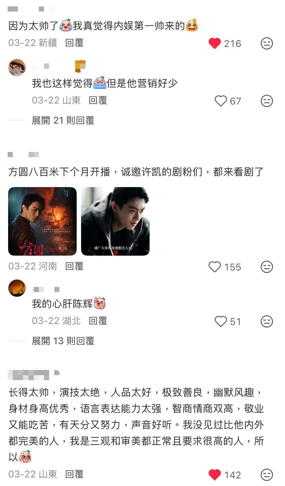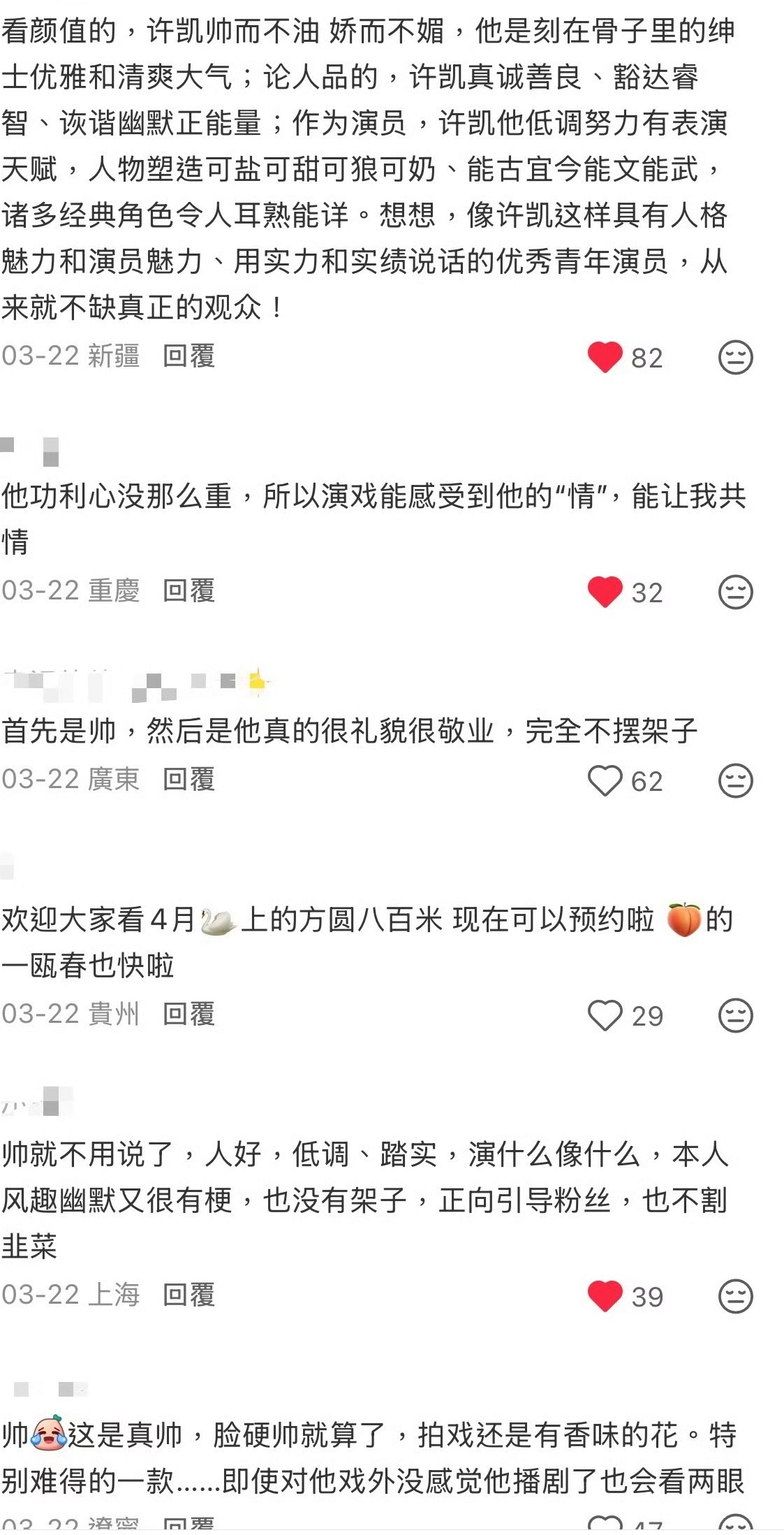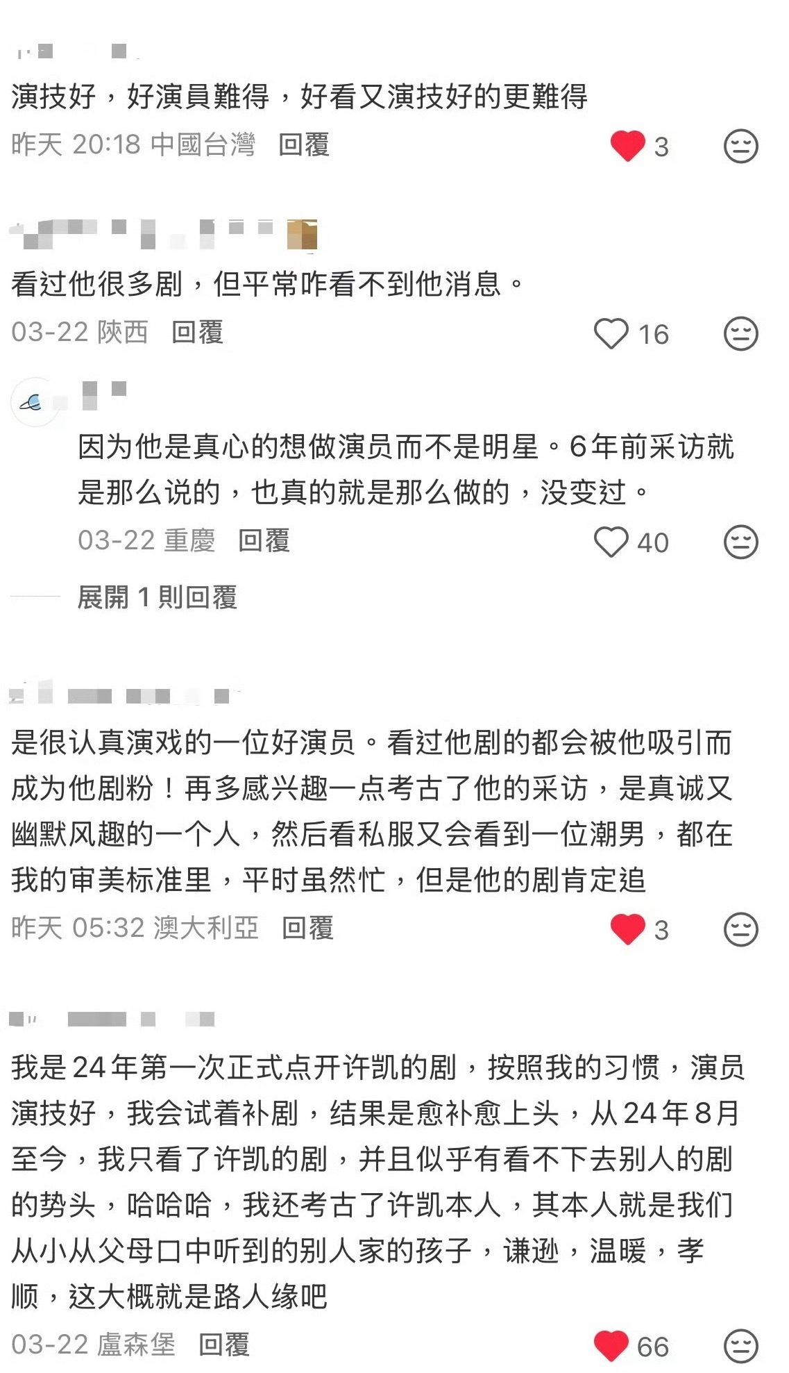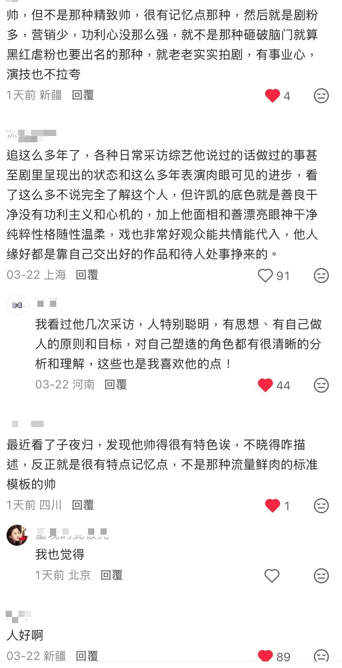 谁能不喜欢又帅又会演戏的许凯呢。路人都是夸夸夸的程度!喜欢许凯,喜欢他作为演员的专业与潜力,也喜欢他作为普通人的真诚与努力。他既有天赋,又肯付出汗水,在竞争激烈的演艺圈中,始终以作品说话,不断突破自我。so对粉丝也永远保持着真诚,亲自收信,给粉丝买奶茶等等,他没有把自己当成那种高高在上,遥不可及的偶像,反而更像是大家的朋友,so真的是个很好很好的人!!!