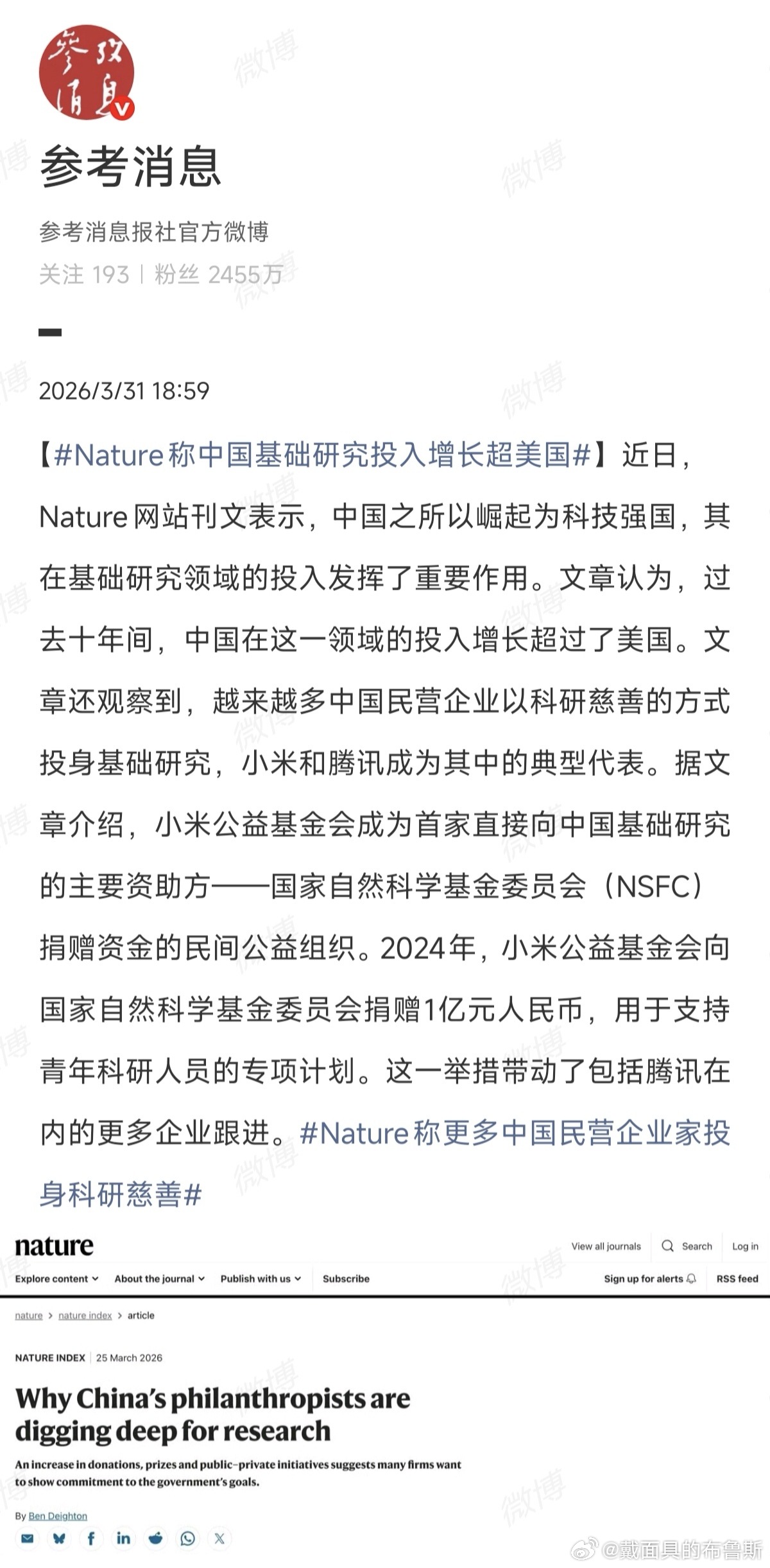 Nature称中国基础研究投入增长超美国 刷到Nature这条新闻还挺感慨的,以前总觉得咱们基础研究跟国外有差距,现在看数据确实很提气。不管是投入增速还是顶刊论文贡献,都在稳步赶超美国,能被国际权威期刊认可,说明这条路走对了。