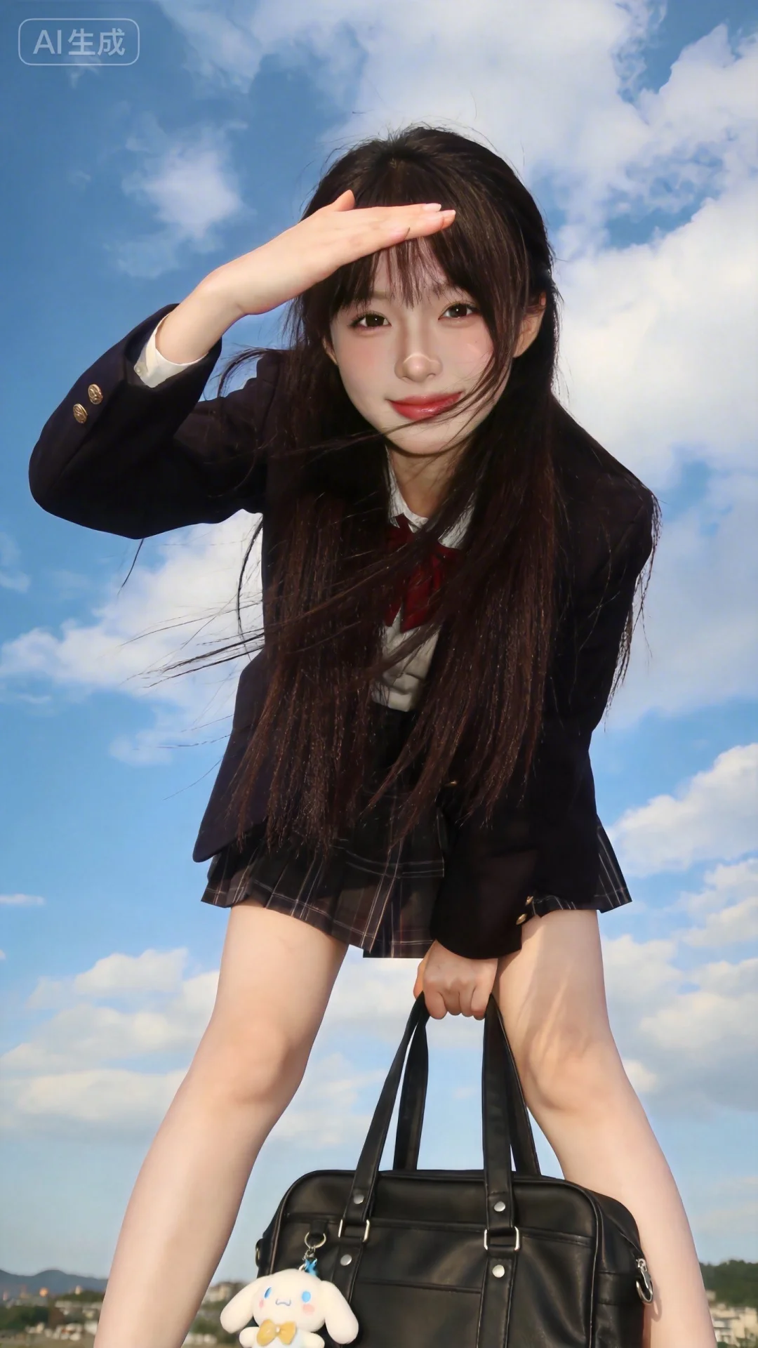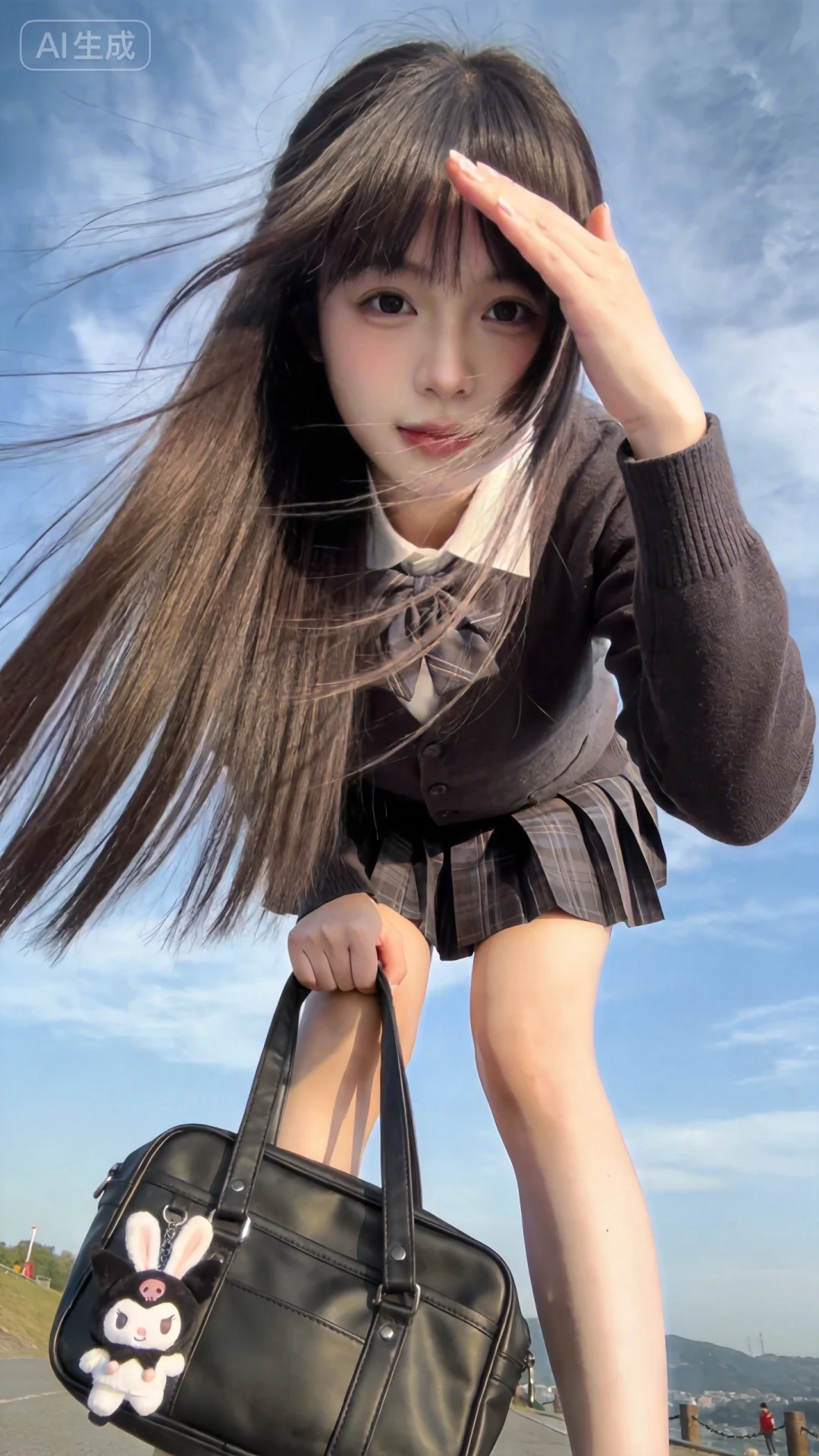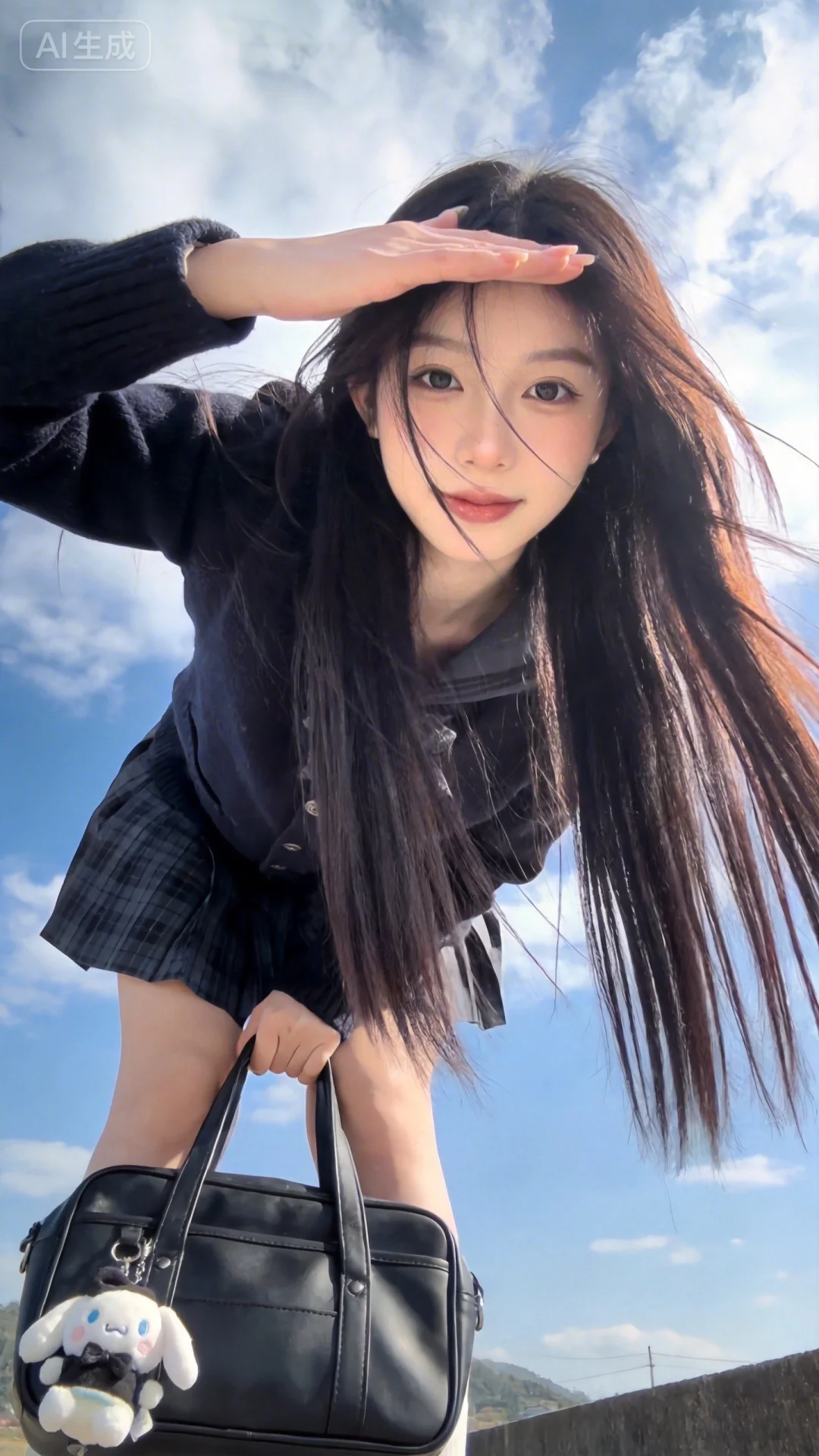 一位长发及腰、模样似洋娃娃般可爱的女生。低角度垂直仰拍看向镜头,失焦感觉,采用超广角,体现动态美学,害羞,感受风,与镜头互动,人像摄影,日常快照风格,非精心构图或打光,小上围,妖冶少女,冷白皮,瓜子脸尖下巴,皮肤白皙,底妆通透,肤色均匀自然,纯欲风,ccd拍照感,发丝在风中凌乱地贴在脸颊和肩前,有着幼态脸蛋。情侣在户外旅游途中拍下的照片,面容精致,面部特写,深棕色长发,身穿深色日式jk秋冬款制服,双腿修长,大长腿,纯欲风,一只手提日式jk制服包,黑色制服包上单侧挂有乌萨奇玩偶挂件,一只手在额头前做遮阳手势,天气阳光明媚,蓝天白云,五官立体,黑色长发整齐顺滑
