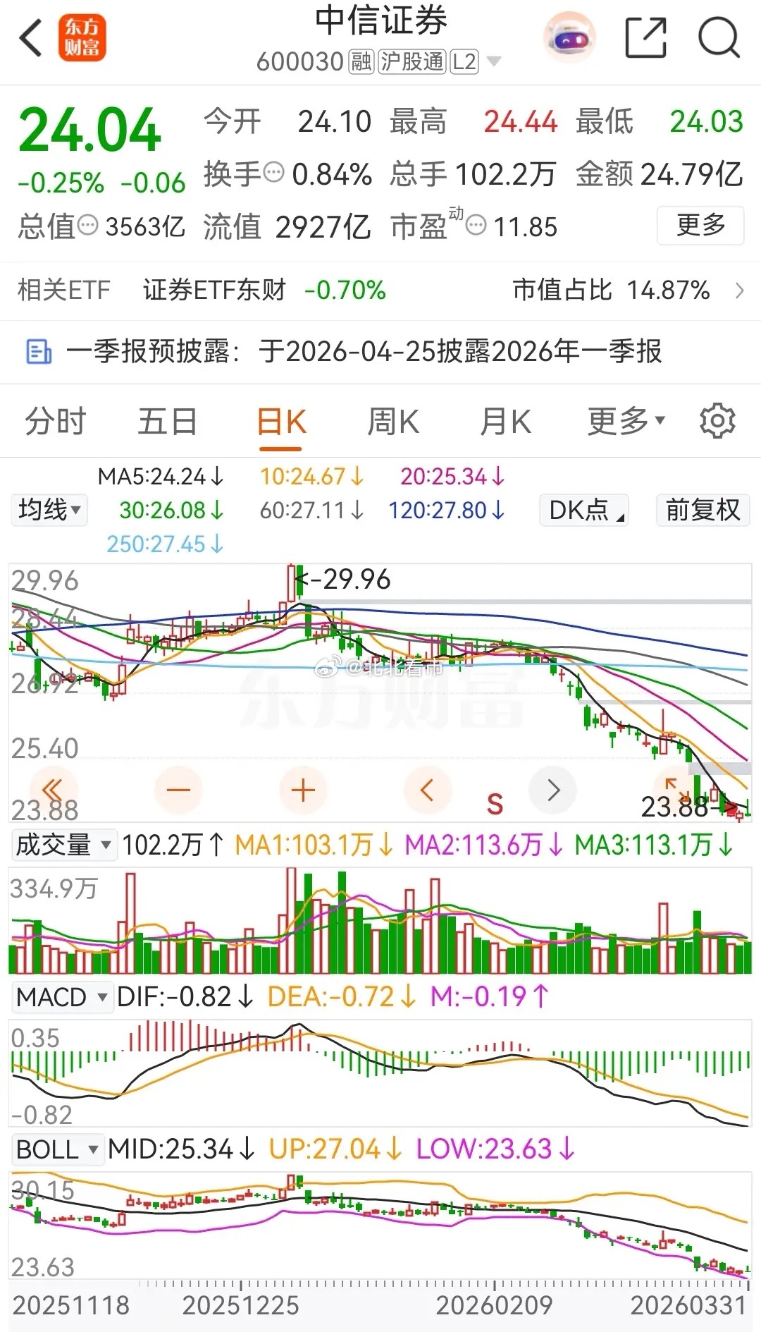 中信证券今天也是冲高后杀跌,收盘报价24.04元,跌幅为0.25%,暂时守住了23元整数关口。在资金流向上,今天被主力资金净卖出了1.4835亿元,目前是连续四天被主力资金净卖出。今天是三月份的收官之日,中信证券在本月的累计跌幅为12.17%,在2026年的累计跌幅为15.41%。
