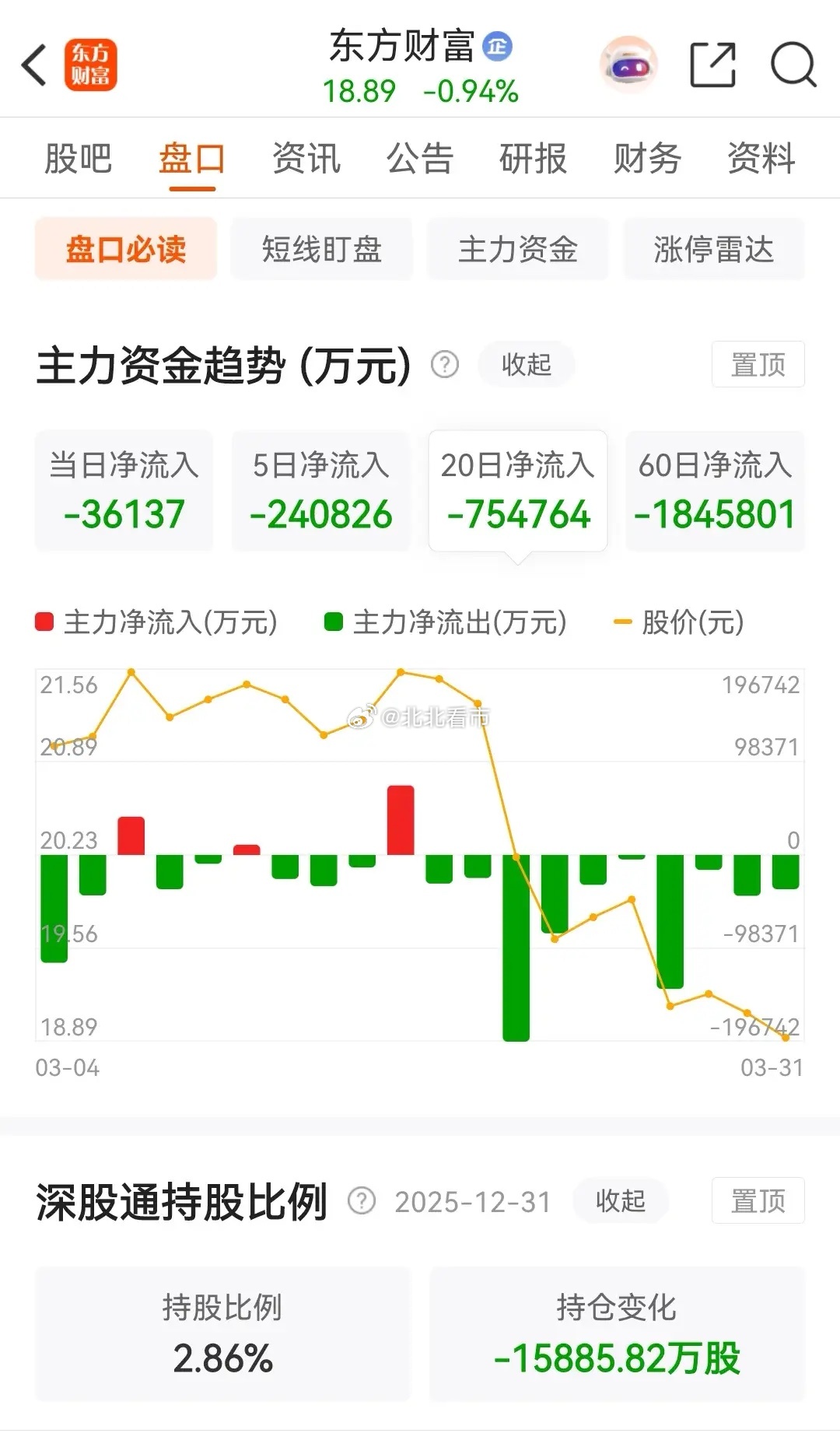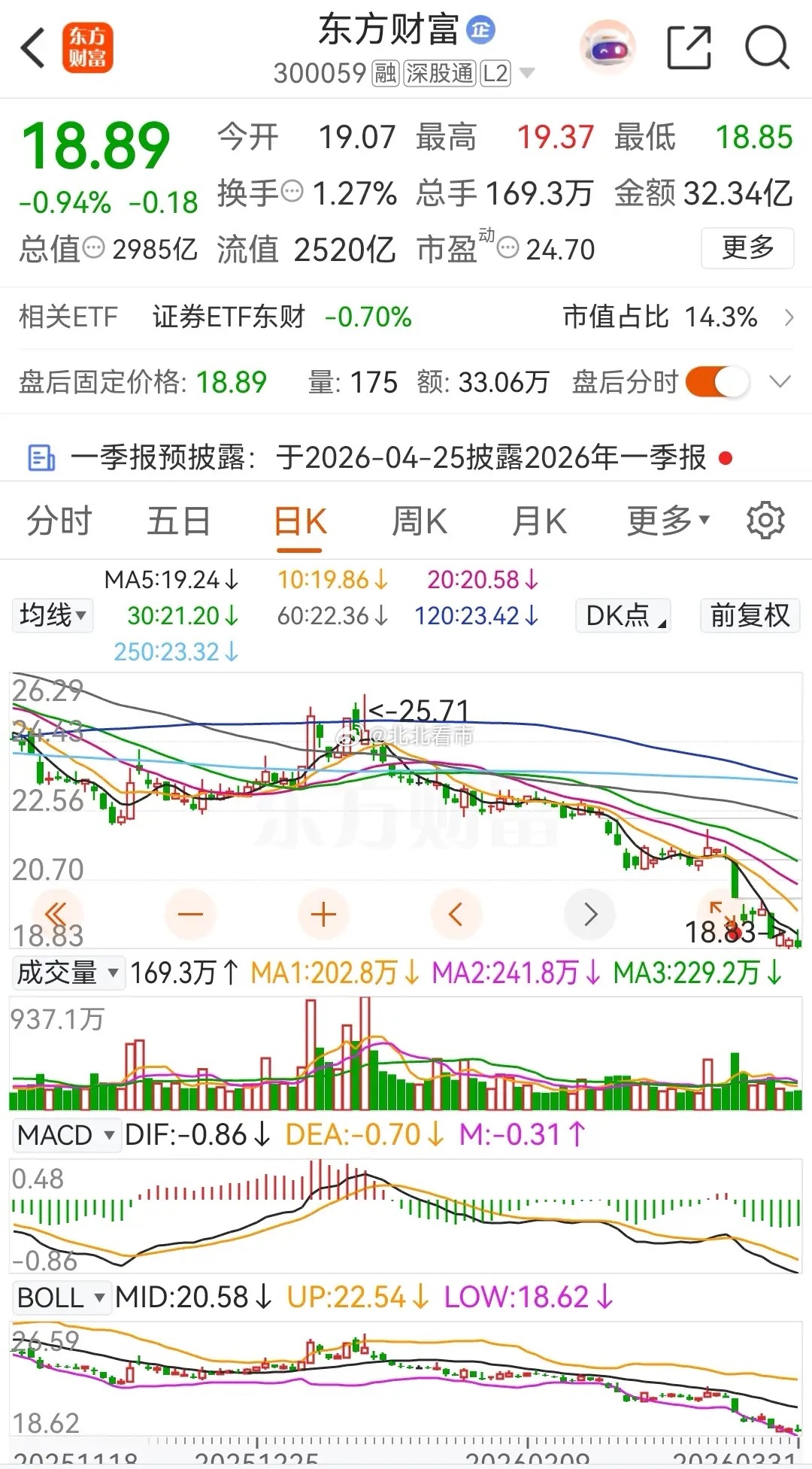 东方财富今天冲高后杀跌,收盘价跌破19元整数关口 ,今日报价18.89元,跌幅为0.94%;本月的跌幅为16.12%,目前已是连续七个月下跌了,本月则是放量大跌,是跌的最惨的一个月;在2026年的累计跌幅约为18.51%。在资金流向上,今天被主力资金净卖出了3.6137亿元,目前已是连续10天被主力资金净卖出了。