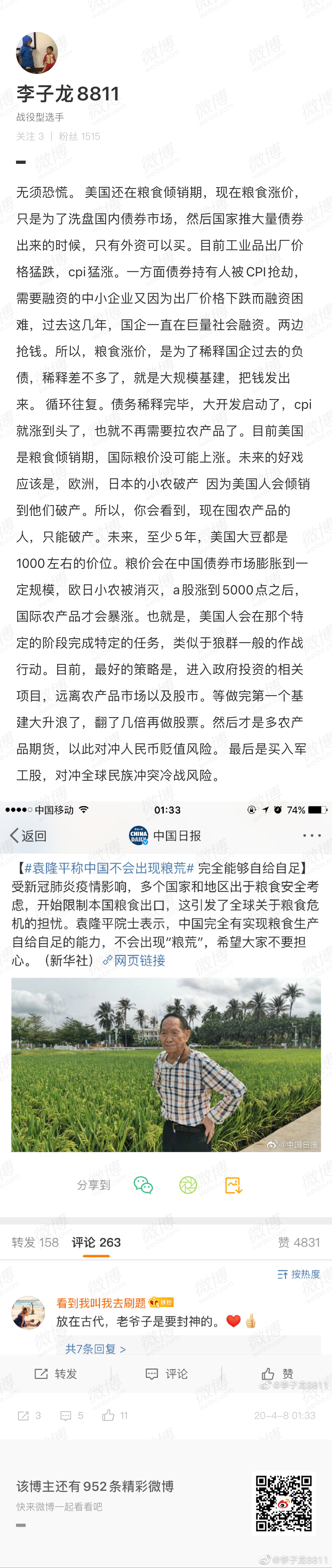 去年4月8号微博里,我谈无需恐慌粮价上涨,谈年底猪肉很便宜,到了今天,猪肉更便宜了。从cpi,ppi,pmi,利率和盈余,外储的组合来说,整体的组合都朝着美国人的目标去:工业品牛市。我们此刻觉得ppi很有意思,年初到今天单边上涨,其实18-20年的cpi更有意思。资金都必须有方向和目标的,并非不可知论或者市场论。猪肉下跌=支出减少=安全感+储蓄提升,ppi上涨=收入增加,当ppi高位震荡,持续一段时间再下来之后,猪肉还是低位,股市又是熊市,则资金就都进入房子了。操盘手的世界很冷漠,也很有趣。小猪农不明白cpi的游戏被消灭了,贸易商不明白ppi的游戏,贸易商被消灭了,储蓄不明白cpi和ppi的游戏,二线楼市储蓄被消灭了。股民不明白操盘手的游戏,现在进去了,不会太好过….