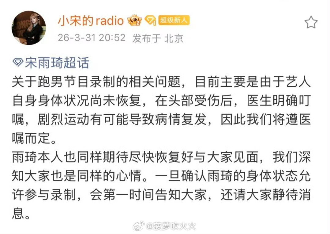 宋雨琦对接回应不录跑男:宋雨琦身体状况尚未恢复,剧烈运动有可能导致病情复发,将遵