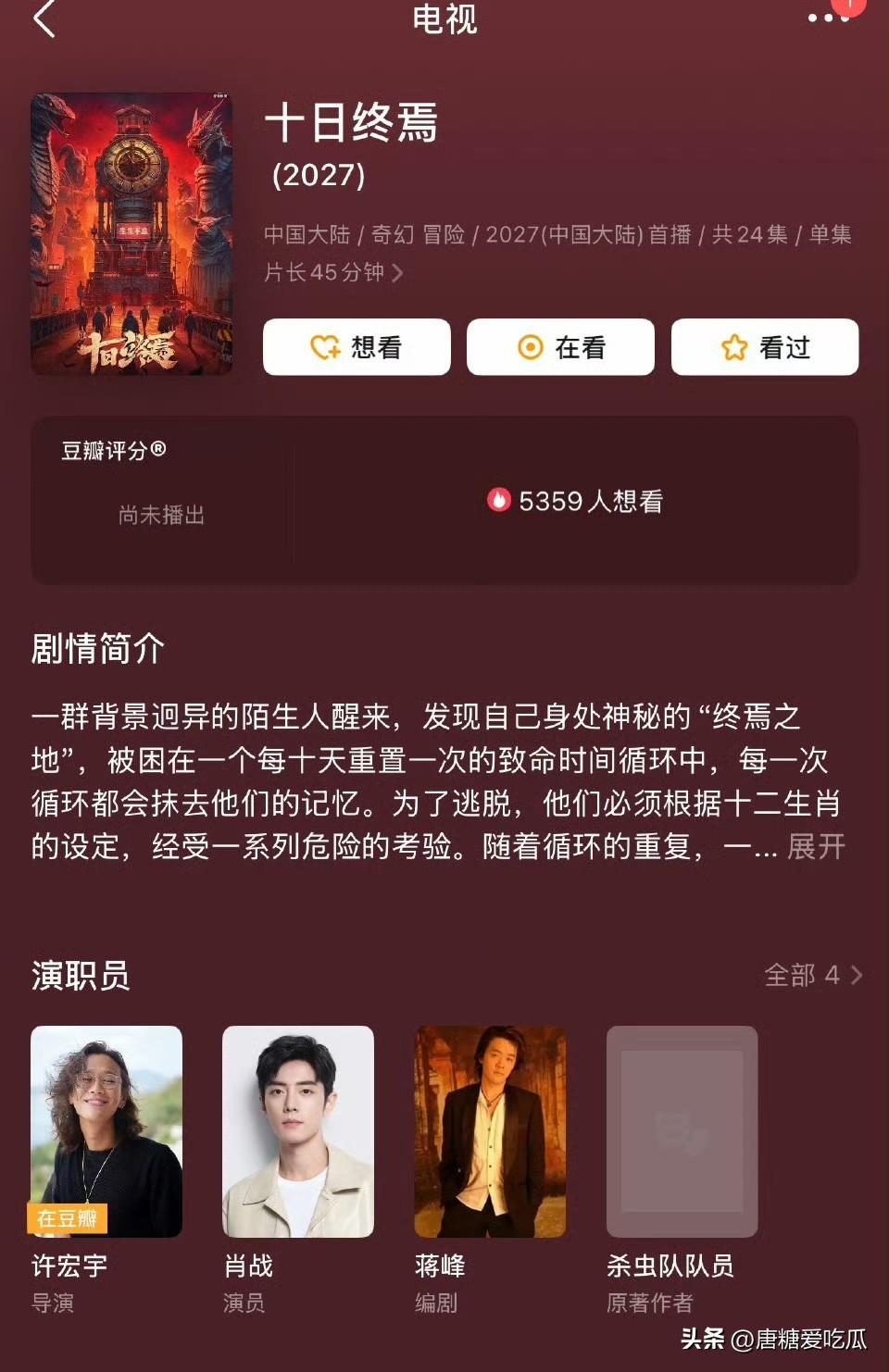 我敢肯定 《十日终焉》将会是肖战又一部爆款 原因有这几点: 一、肖战演技肉眼可见的得到提升,拍电影,合作大导演,接触老前辈,从陈情令的简单表演到现在已经可以完成复杂的情感表演,演技实力在线。 二、《十日终焉》题材新颖,属于内娱没有涉及的风格,原著粉丝数量庞大,改编巨流小说,要热度有热度,要流量有流量。 三、演员阵容容错率高,全是有口碑有演技的中生代演员,魏大勋,李泽锋,胡先煦,李治廷,有演技又有一定的受众市场,再加上肖战顶流的影响力,同期播出绝对会力压群雄。