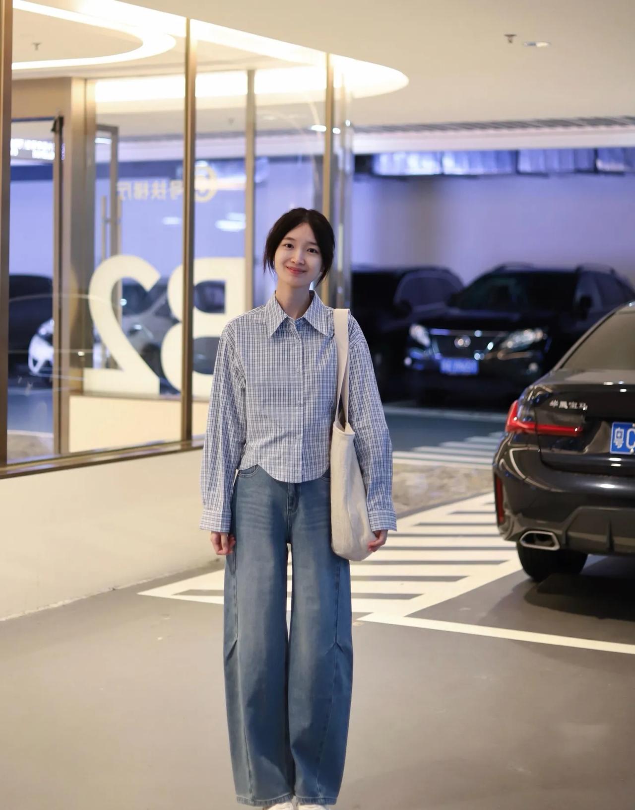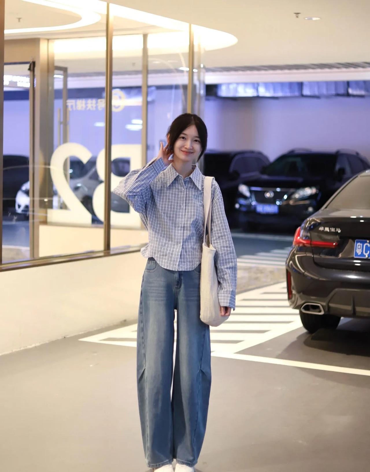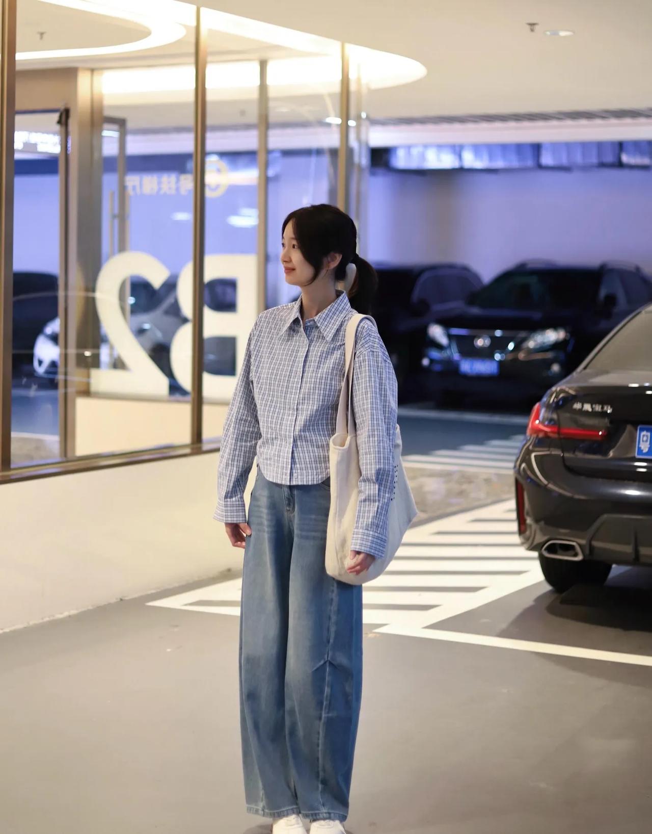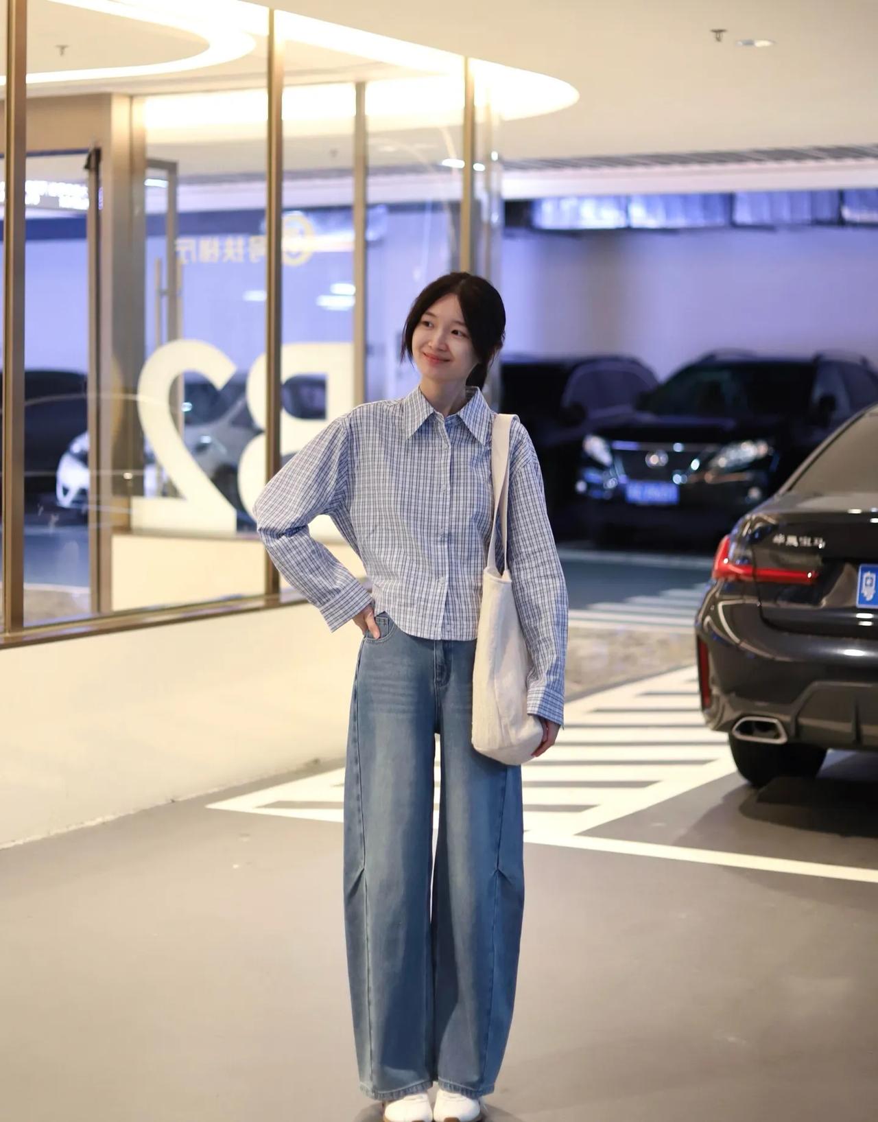 衬衫配牛仔裤,永远的神!🧩 蓝白格短款衬衫+垂感阔腿牛仔裤,松弛感拉满还巨