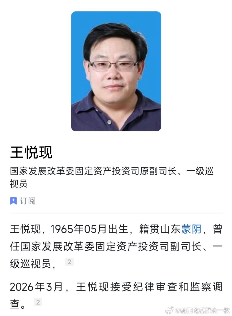 国家发展改革委固定资产投资司原副司长、一级巡视员王悦现接受纪律审查和监察调查。