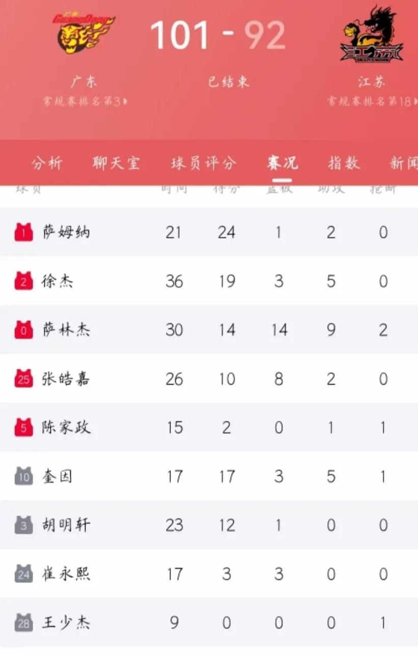 广东队艰难战胜江苏,比赛结束后,球员回到更衣室路上,球迷大喊张皓嘉名字,有的称嘉哥,有的叫嘉爷。一度让张皓嘉热泪盈眶,不容易啊。 回想前三节,张皓嘉一直的打铁,就连罚球都不进一个,到了第四节被对手当于德豪看待,放空让你投。嘉哥凭着打了七年的功底,强大的心理素质,终于大放光彩一把,有三分有补篮有篮板有助攻有封盖,什么徐杰,庞老六一边去,风头是我的。 相比上一场打四川,几乎打满全场才得2分的张皓嘉,这场比赛出场27分钟,得到10分8板2助2盖帽的全面数据,虽然正负值是负的,但已经非常高光了。 希望通过这场比赛,张皓嘉来个凤凰涅槃,不为别的,为自己为杜锋争口气。