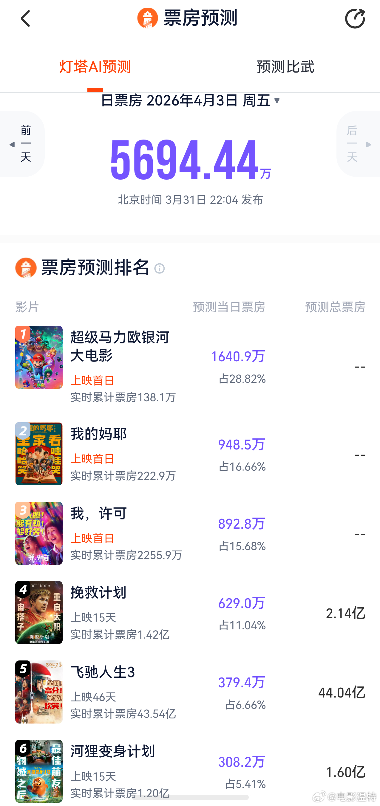 听听温特怎么说 猫塔专业版预测4月3日票房接近6000万,《马里奥》1640万—