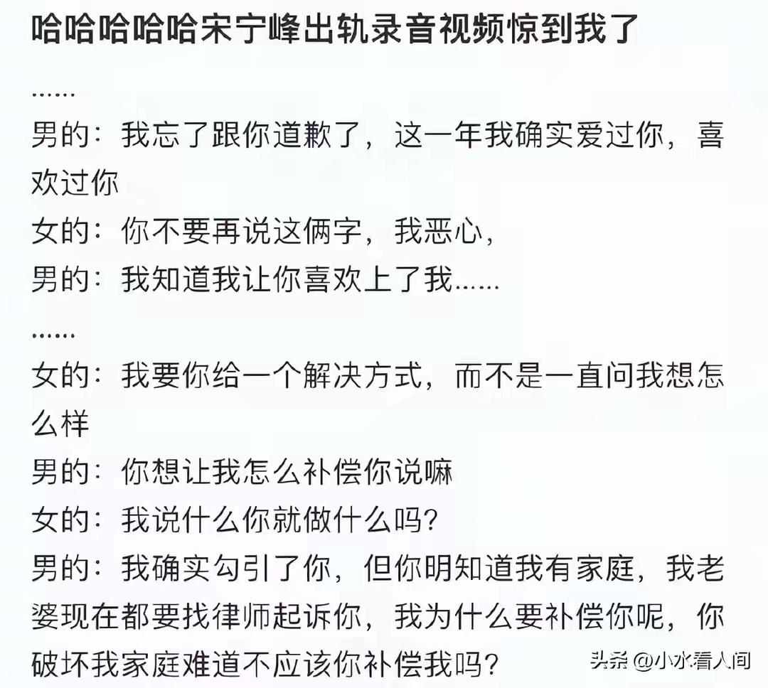 昨夜娱乐圈有一大瓜诞生:北京KTV私会现场录音曝光!45岁宋宁峰出轨竟带5岁女儿同床,妻子张婉婷持裸照威胁小三波及演员高露 娱乐圈的瓜田从未荒芜,但这一次的“果实”却酸涩到令人脊背发凉。2026年3月31日,一则带着录音实锤的爆料,将演员宋宁峰钉在了道德的耻辱柱上。这不仅仅是简单的婚内出轨,更是一场践踏人伦底线、让亲生女儿目击不堪的荒诞剧。 据爆料,这场始于2025年1月北京某工作酒局的孽缘,男主角宋宁峰对被称为Q女士的圈外女子展开狂热追求。他一边隐瞒已婚身份,一边编织着“必定离婚”的甜蜜谎言,让Q女士陷入了“知三当三”的漩涡。互发裸照的激情背后,是早已埋下的惊天雷。 纸终究包不住火。2026年3月,妻子张婉婷察觉端倪。这位以强势著称的经纪人,没有第一时间手撕丈夫,反而调转枪口对准Q女士。聊天记录里,她以手中掌握的裸照为武器,发出冰冷威胁:“需要我发给你妈妈吗?发给高露吗?”无辜的演员高露只因是Q女士好友便被卷入,堪称“人在家中坐,祸从天上来”。 然而,真正击穿公众心理防线的,是后续曝光的录音。当Q女士质问宋宁峰为何退缩时,他懦弱地承认勾引,却反咬对方破坏家庭。更炸裂的是Q女士的控诉:“你带着安娜(女儿)跟我在床上那什么的时候,你没想过责任吗?”这句话,让整个事件从道德丑闻滑向了人性沦丧的深渊。 一个父亲,如何能将自己年幼的女儿置于如此不堪的境地?孩子清澈的眼睛,看到的应是世界的纯真,而非父亲背叛家庭的龌龊现场。这已远超娱乐八卦的范畴,这是对父职的彻底亵渎,是对孩童心灵可能造成终身阴影的恶行。 事件中的两个女人,同样可悲。Q女士手握证据反击,却也难逃“知三当三”的指责。张婉婷的愤怒与威胁看似彪悍,实则将矛头对准了同性,而那个真正该承担全部责任的男人,却一度隐身。她们的相互撕扯,恰恰成了宋宁峰懦弱与自私的最佳注脚。 纵观宋宁峰的情感轨迹,从与齐溪的七年婚姻终结,到与张婉婷闪孕闪婚并登上《再见爱人》展示一地鸡毛,其处理亲密关系的能力早已亮起红灯。节目中的压抑与窒息,或许能解释部分行为动机,但绝不能成为突破底线、伤害孩子的借口。 截至目前,宋宁峰与张婉婷均未回应。但沉默无法洗刷污点。公众的愤怒不仅在于出轨本身,更在于他身为父亲,亲手撕碎了为孩子遮风挡雨的保护伞。娱乐圈的滤镜碎了一地,这次碎掉的,还有最基本的人伦常情。 宋宁峰出轨 带女儿出轨 人性底线 娱乐圈地震 (来源: 洵哥创作本文综合整理自2026年3月31日网络曝光的聊天记录、录音资料及多家娱乐媒体报道)