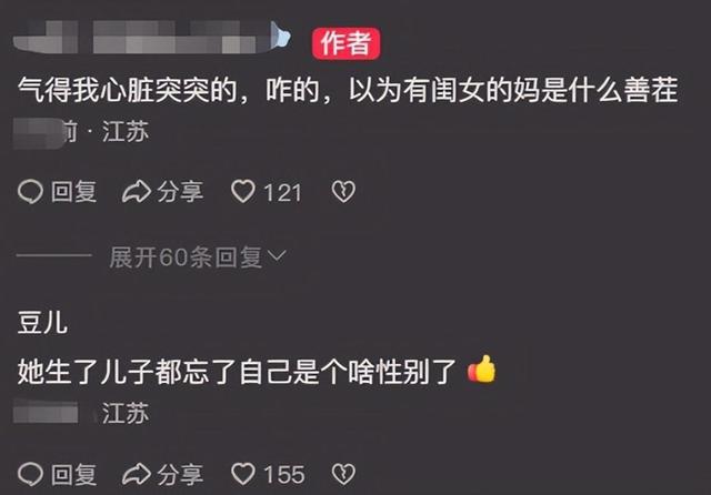“女儿再优秀也得给我儿当保姆?”江苏男宝妈惊人言论引爆全网,女孩妈霸气回怼揭穿千年算计! 当一位母亲精心记录女儿成长点滴时,评论区竟闯入一位陌生“男宝妈”留下刺眼宣言:“你家女儿再优秀,将来也是给我儿子洗衣做饭的命!”这番言论瞬间点燃了全网怒火。都2026年了,竟还有人将女性价值捆绑在“服务男性”的陈旧枷锁中,仿佛大清的辫子还长在心里。 女孩母亲的反击如一道惊雷:“第一次起了杀心!我女儿的人生凭什么由你定义?”这句话道出了千万家庭的心声。如今养育女儿,早已不是培养“贤妻良母”,而是塑造独立灵魂。那些幻想靠婚姻掠夺他人资源的算计,在清醒的时代面前不堪一击。 网友的嘲讽更是犀利:“建议您穿越回清朝,那儿正缺太后。”“您儿子怕是连对象都找不到,就开始做梦继承别家财产了?”笑声背后是深深的悲哀。这种将人物化的思维,暴露了某些人认知的贫瘠——自己无力奋斗,便指望靠婚姻“空手套白狼”。 更可怕的是,这种言论背后藏着扭曲的教育观。把儿子养成“吸血巨婴”,把未来儿媳视为“服务工具”,最终只会让孩子失去独立人格。现代社会早己淘汰这种寄生逻辑,真正的幸福从来靠的是双手创造,而非处心积虑的算计。 那位霸气母亲的话虽狠,却折射出当代父母的觉醒:我们要给女儿的不仅是宠爱,更是识破陷阱的锐眼和说不的底气。让她明白,人生价值在于翱翔天际,而非困于灶台。婚姻应是双向奔赴,而非单方面奉献。 这场风波也给所有父母敲响警钟。教育孩子,不是教他们如何占便宜,而是培养尊重、独立与担当。无论儿子女儿,都应成为有光芒的个体。那些沉迷于“吃绝户”美梦的人,终将被现实狠狠教育。 最后,请记住:优秀的女孩,不会跳入充满算计的牢笼;真正的赢家,永远是那些精神独立、灵魂自由的强者。守护好自己的孩子,远比算计他人更重要。 (来源:洵哥根据网络热议事件及社会观察综合撰写) 重男轻女 女性觉醒