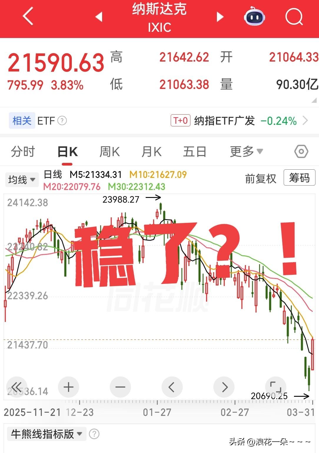 牛啊!大A今天稳了?! 一大早,看了看美股收盘情况,三大股指强势反弹,A股今天稳了,因为美股涨的太多了,纳斯达克大涨3.8%,道琼斯大涨2.49%,标普500大涨2.91%,美股科技股全面反弹! 所以说,今天亚太股市将全面高开,A股也一样,而且我判断还要高开很多,昨天买进的,今天要发财了。 但是要注意啊,防止大于高开低走,高开高走的时候也有,但是很少。大家拭目以待吧!今天行情反正不差,普涨,科技股大涨?加油! 个人观点,仅供参考。