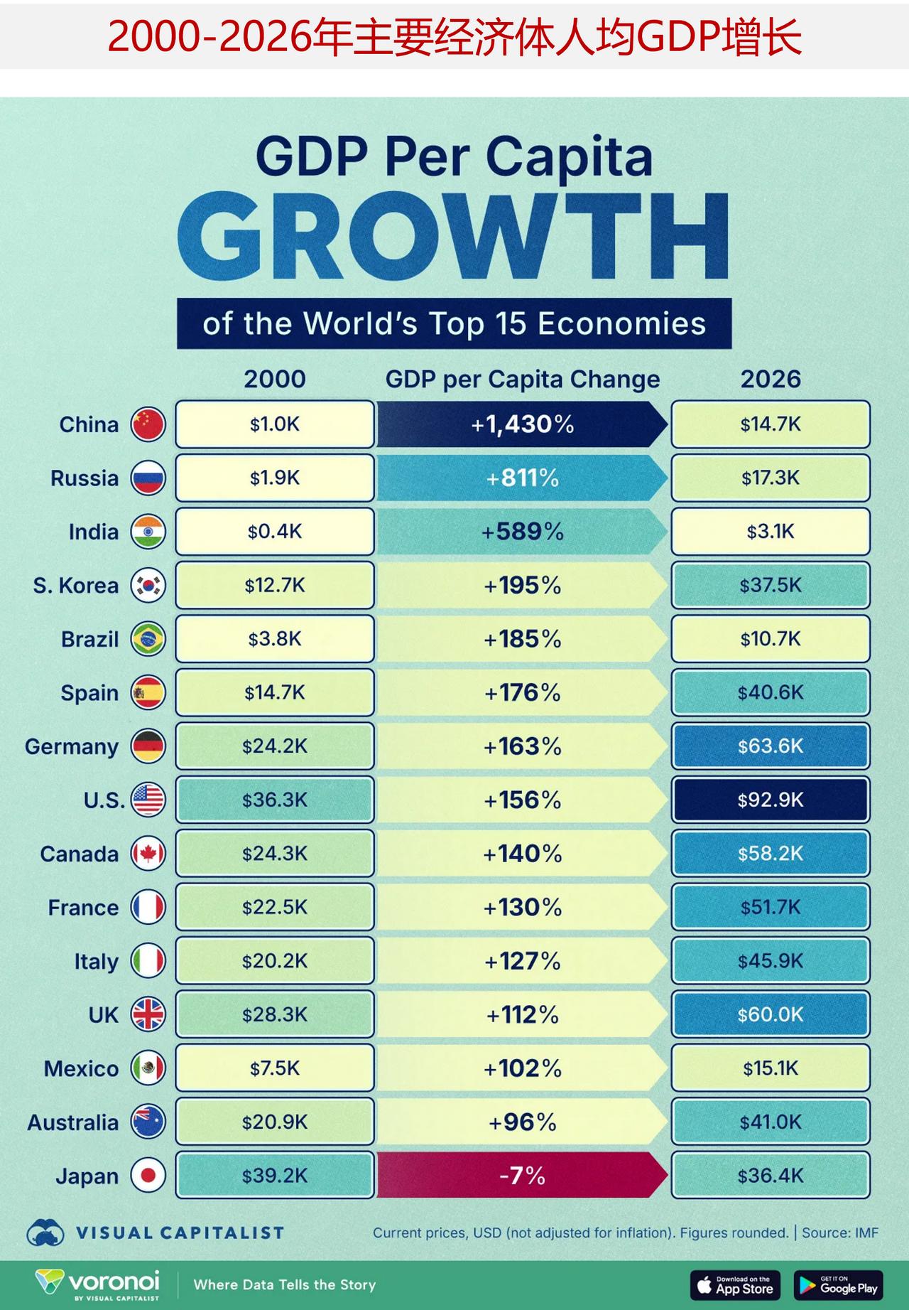 2000-2026年主要经济体人均GDP增长分化:新兴市场领跑,日本独现下滑 过去25年间,全球主要经济体的人均经济产出增速呈现出显著差异。 下面图表基于国际货币基金组织(IMF)数据,梳理了2000至2026年15个主要经济体的人均GDP增长情况,清晰呈现了哪些国家的民众生活水平提升最为显著。 数据显示出鲜明的分化特征:中国、印度等新兴市场国家人均产出实现快速增长,而发达经济体增速相对放缓、走势更不均衡,其中日本成为唯一人均GDP出现下滑的主要经济体。 ——过去四分之一世纪的不均衡增长 在主要经济体中,中国的增速遥遥领先,人均GDP从2000年的约1000美元攀升至2026年的1.47万美元,增幅达1430%。 这意味着按百分比计算,中国的人均产出增量超过其他任何主要经济体,从根本上重塑了其在全球中产阶层中的地位。印度同样实现了大幅增长,人均GDP从400美元升至3100美元,是全球人均GDP涨幅最显著的国家之一。 俄罗斯人均GDP增长811%,在1998年金融危机后实现了强劲的经济复苏。 2000年前后,俄罗斯在经历数十年石油产量下滑后开始大幅提升石油开采规模,成为推动经济复苏的核心动力。2000年其能源资产国有化比例约为10%,但在不到十年内飙升至近50%。 与此同时,凭借制造业实力,韩国人均GDP增长逾两倍,达到3.75万美元。2000年以来,韩国完成了从新兴市场到发达经济体的转型,当前人均GDP已超过日本。 类似地,在21世纪初大宗商品繁荣的推动下,巴西人均GDP实现显著增长,不过随后十年增速有所放缓。 ——发达经济体增长放缓 尽管富裕国家的增速相对低于发展中市场,但发达经济体内部也出现了明显差距。 总体而言,西班牙增速最快,人均GDP增长176%。2025年,在国内消费与旅游业的支撑下,其经济增速几乎达到欧元区国家的两倍。 德国人均GDP增长163%,甚至超过美国156%的增幅。但与西班牙不同的是,受出口疲软影响,德国近期经济增长陷入低迷。 日本是唯一主要经济体中人均GDP较2000年更低的国家。受低通胀、人口增长放缓以及长期经济停滞等因素共同影响,日本当前人均GDP较2000年已下降7%。