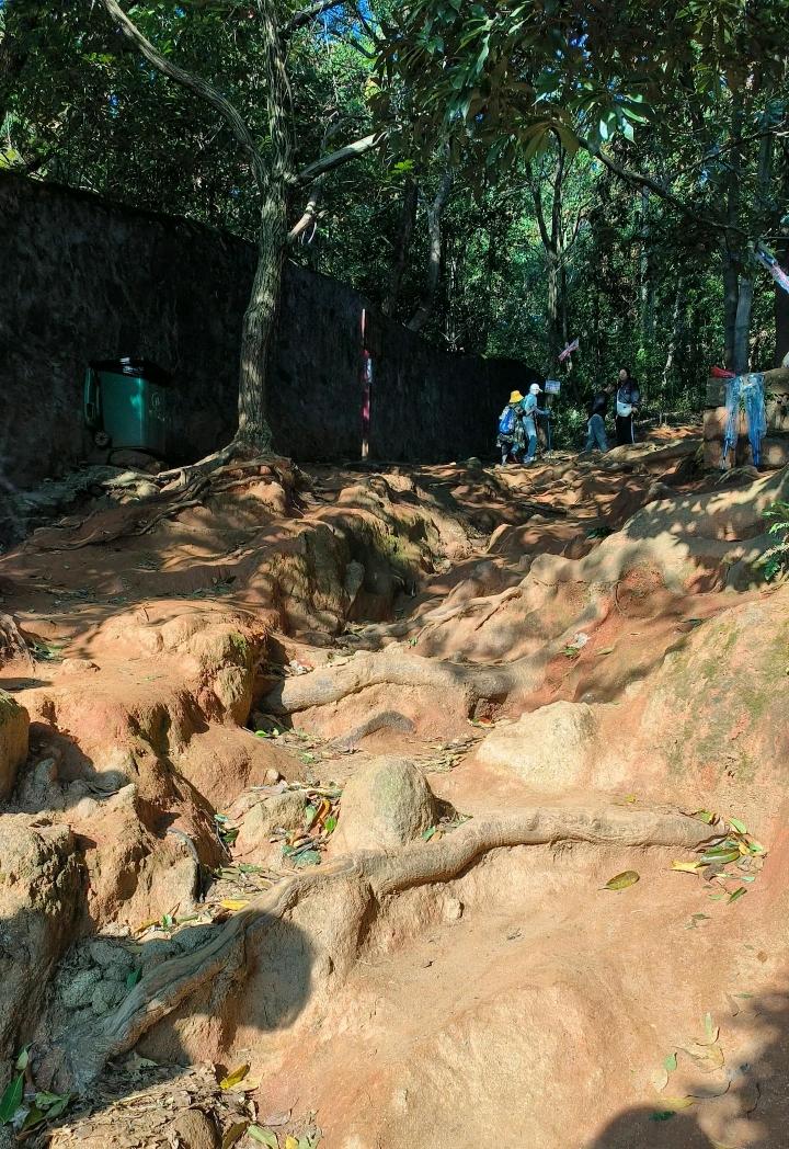 几名老人徒步去爬南昌老四坡,爬到半山腰时,一老太太体力不支,靠在树干上大口大口喘