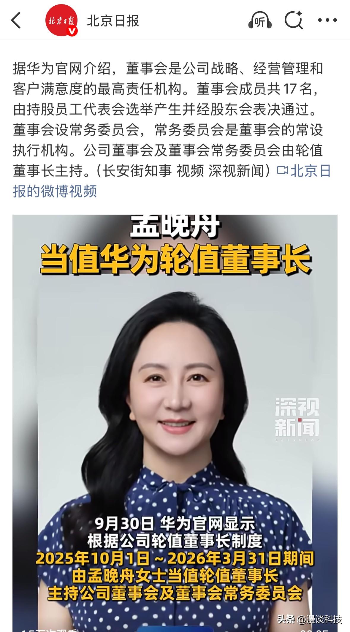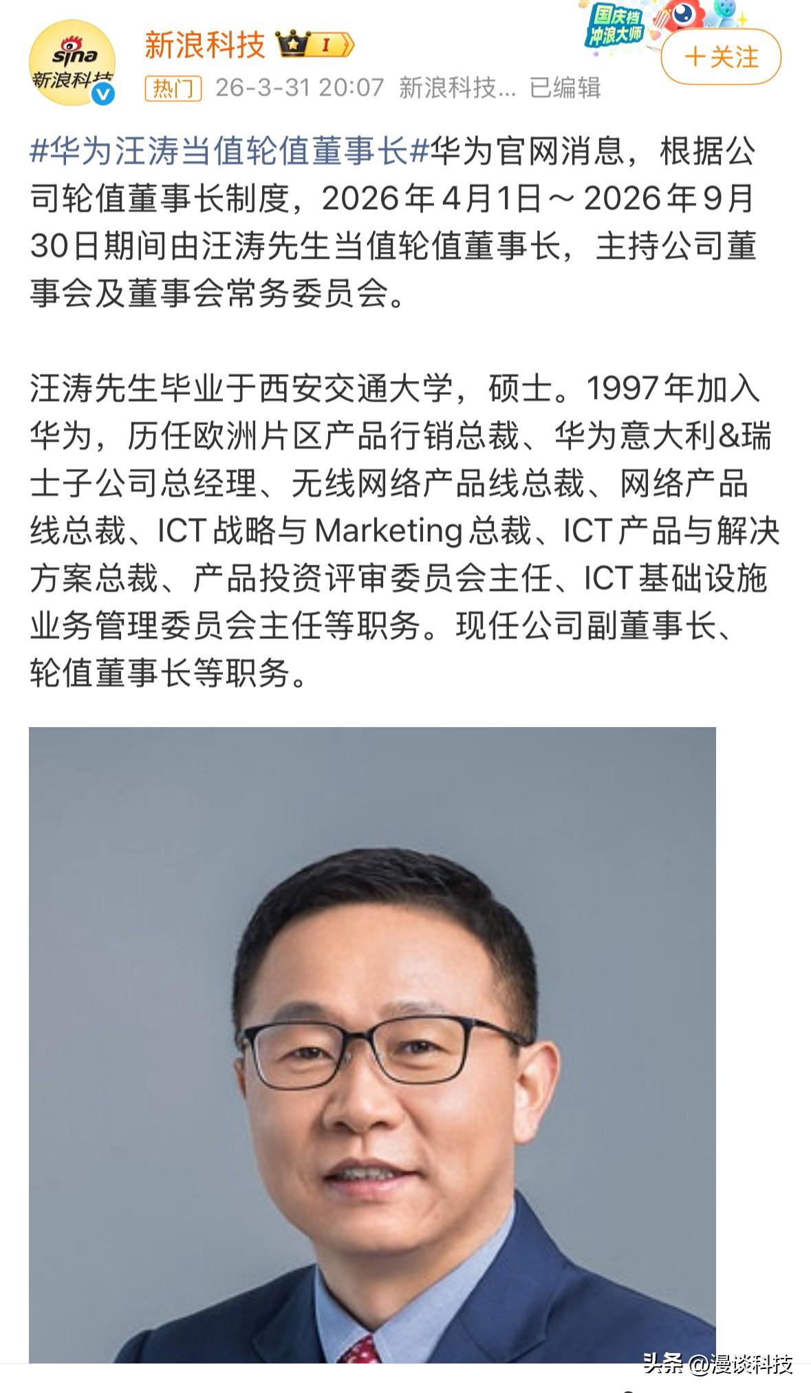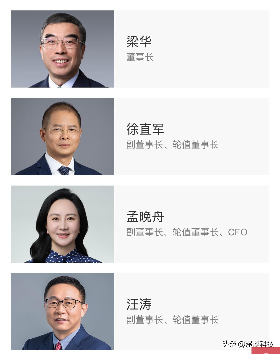 华为轮值董事长“三人组”换人了,此前,该职位由三名副董事长徐直军、胡厚崑、孟晚舟依次担任,每次轮值期为六个月。如今,根据华为官网显示,胡厚琨已经不再担任轮值董事长职务,只保留董事职务,汪涛成为副董事长、轮值董事长。