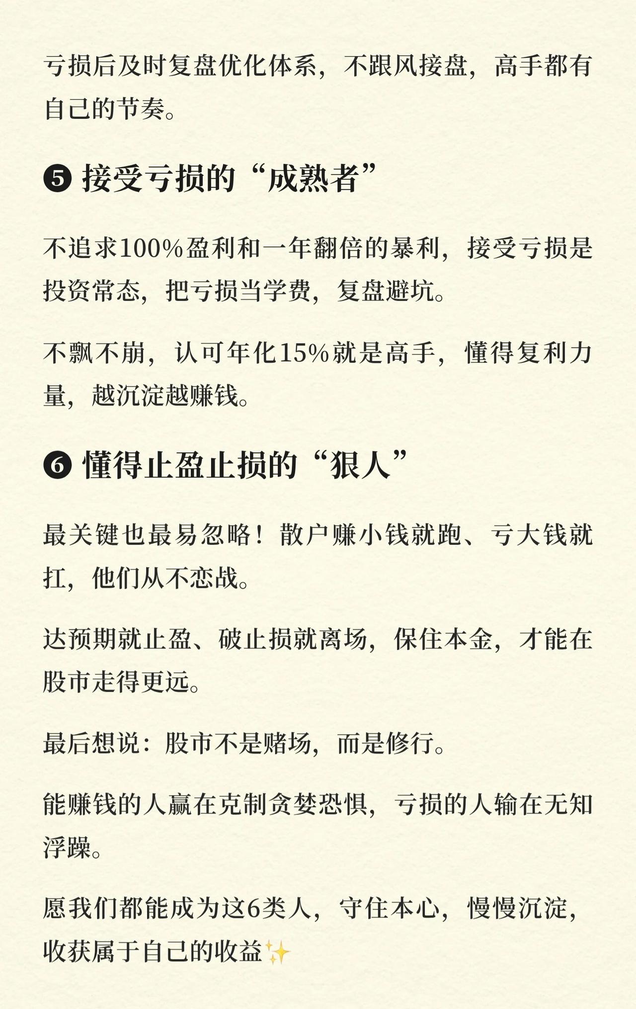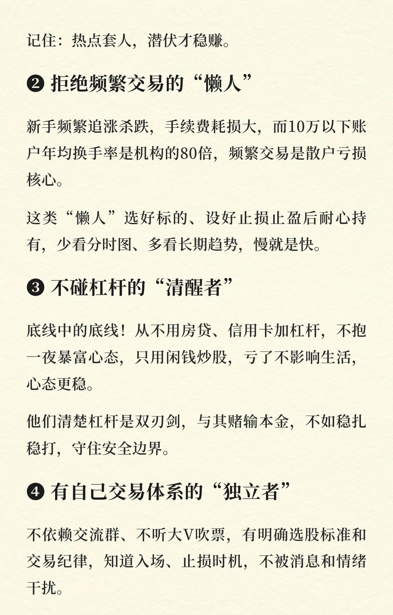 股市中能长期赚钱的六类人,核心在于有逻辑、守纪律,而非聪明或运气。 1. 潜伏者:不追热点,在市场恐慌、优质股被低估时布局,等待价值回归。 2. 懒人:拒绝频繁交易,选好标的后耐心持有,看重长期趋势。 3. 清醒者:不碰杠杆,只用闲钱炒股,守住安全边界,心态稳定。 4. 独立者:有自己完整的交易体系,不依赖他人,不被消息和情绪干扰。 5. 成熟者:接受亏损是投资常态,不追求暴利,懂得通过复盘和复利积累收益。 6. 狠人:懂得及时止盈止损,保住本金,不恋战,不把小赚变成大亏。 核心主旨:股市是一场修行,赚钱的关键在于克制贪婪与恐惧。