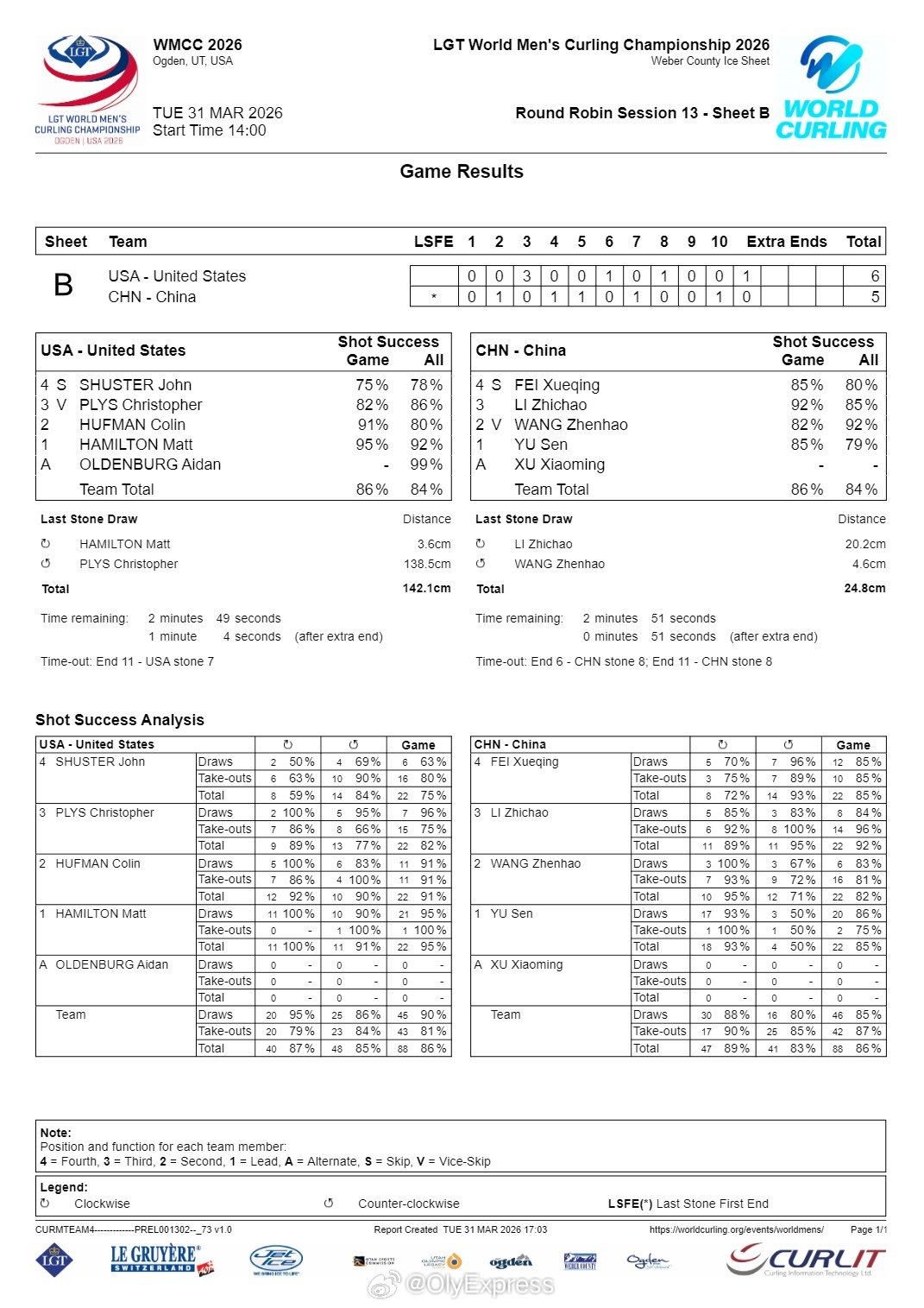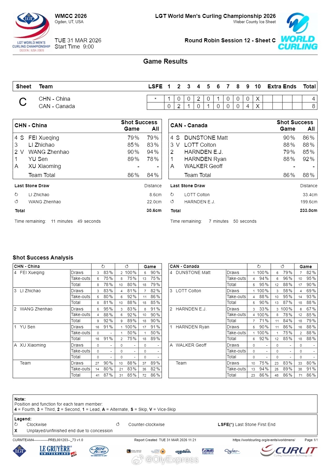 【男子冰壶世锦赛中国连输加拿大美国】2026男子冰壶世锦赛 3月31日美国奥格登
