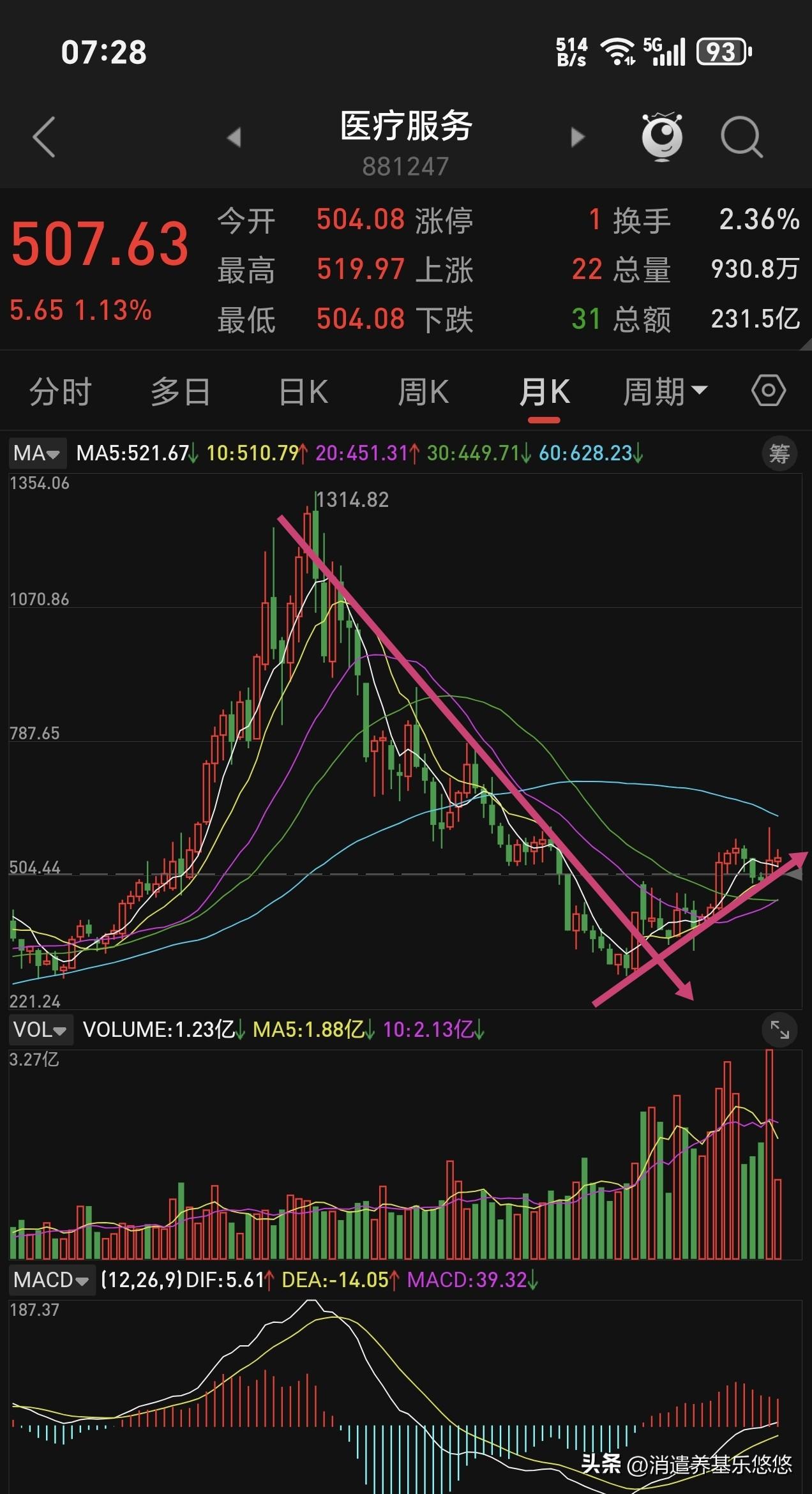 医疗基金路还很长。下图是医疗板块日线月线走势图,从月线走势来看,经过几年的下跌,目前已经走出长期下跌压力线,明显的处于底部区域,从长期看,它的反弹空间非常大。但是,不可能再走持续性上涨,大环境不好,它只能是阶段性反弹,长期持有整体上安全性比较高,这个长期起码是一年以上。 从它的日线走势来看,现在已经突破了下降趋势线,5-10-20日线上升,昨天受30日线压制回落,上面还有一个60日线压力。预计这次反弹能到60日线压力位附近,过去60日线再看后期走势。 总之,医疗板块最坏的时期已经过去,重仓亏损的不要悲观失望了,苦日子快熬到头了,低位补仓降低成本,很快就会盈利,而不是现在割肉止损。空仓轻仓的可以分期低吸布局,做波段操作。