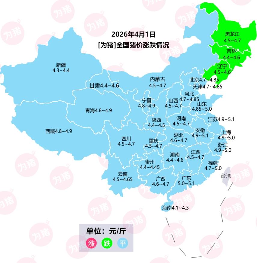 4月1日猪价 | 稳定为主,猪企、散户都稳! 今日全国生猪收购均价呈现下跌态势,全国外三元标猪均价4.64元/斤,环比昨天下跌0.01元/斤,上涨地区0个,下跌地区3个,稳定地区25个,全国生猪收购最低价为新疆,价格为4.4元/斤,最高价为广东,价格为5.1元/斤。 全国猪价企稳,部分猪企有增量现象,今日河南一哥出栏价格小体重4块89,大体重4块8,广东大场挂牌价格继续稳定在5块3,散户今日稳定为主,低价区有补涨1毛的现象。近期各大央媒关注生狸价格,更是强调养殖户合理优化种群结构 ,严控盲目扩产,主动降本增效,看来今年上半年继续要去产能,各位养猪老板们,你们那边今天价格稳定了吗,欢迎大家在评论区留言。