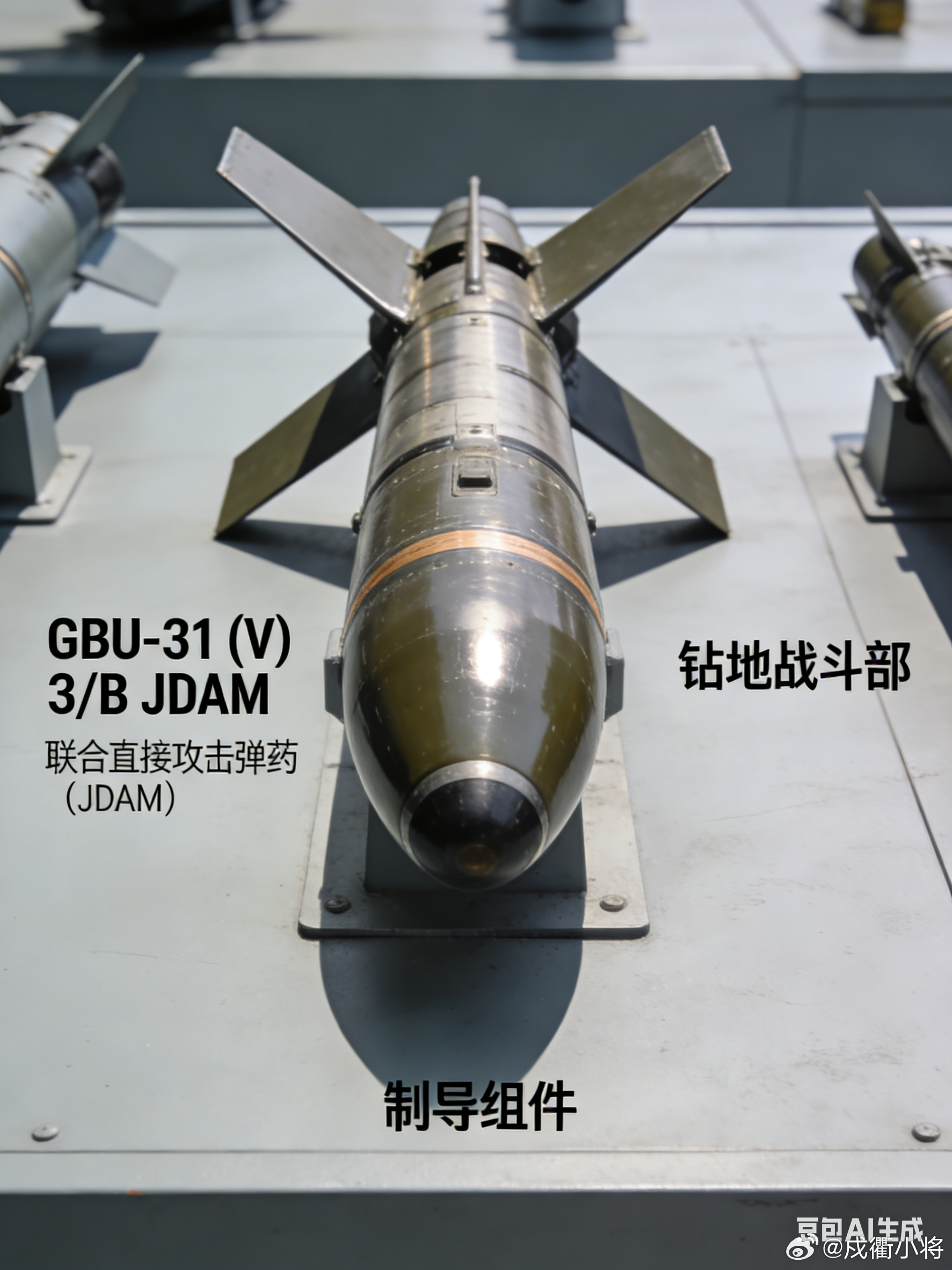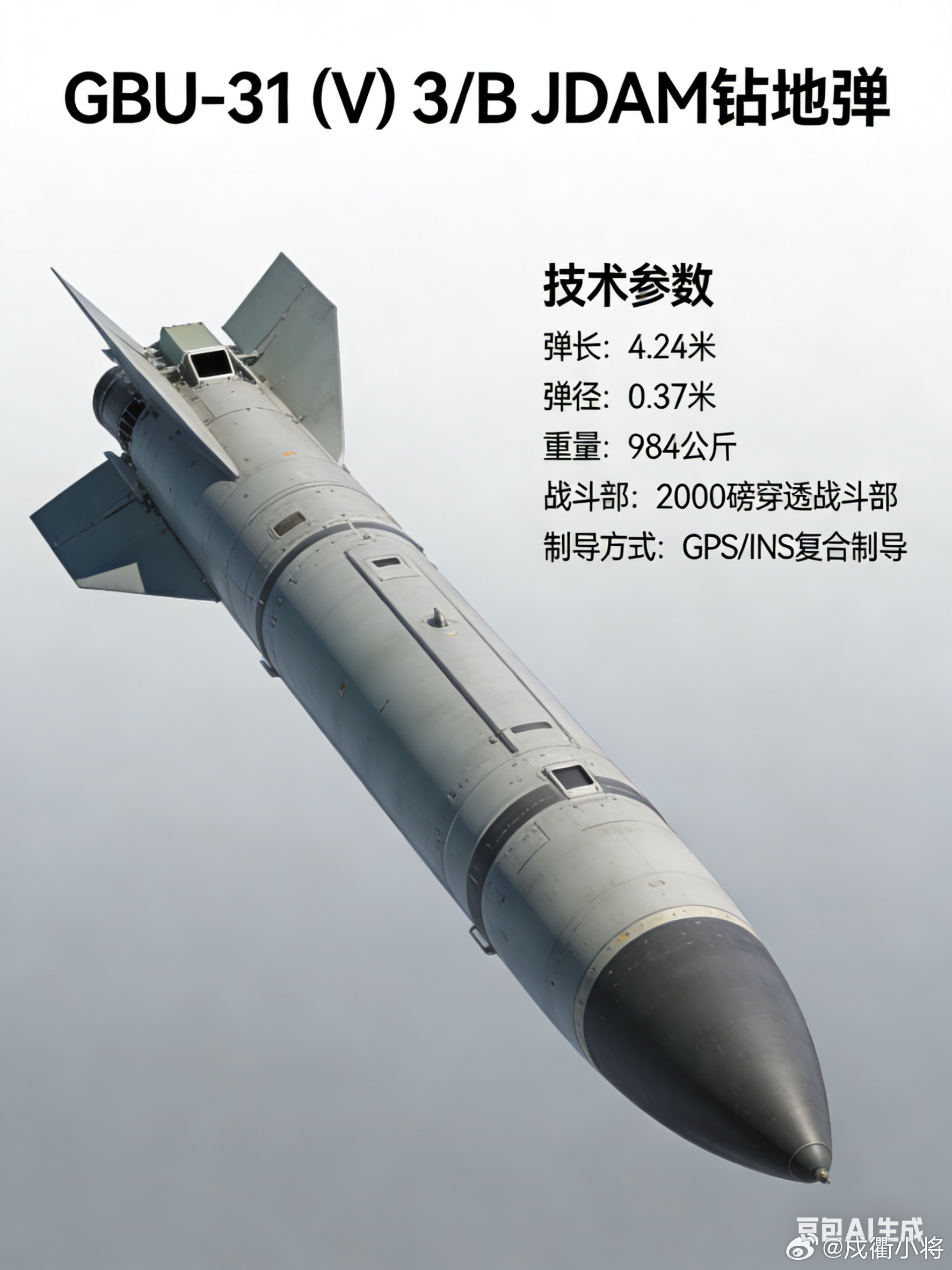 GBU-31 (V) 3/B JDAM是美军2000磅级精确制导钻地弹,由JDAM GPS/INS双模制导套件搭配BLU-109/B侵彻战斗部组成,主要用于打击地下指挥所、加固掩体等硬质纵深目标。该弹全重约907-961kg,弹长3.76m,搭载240kg高能炸药,采用FMU系列延时引信,可穿透1.8米钢筋混凝土后在目标内部起爆,毁伤效果极强。其制导精度高,GPS模式下圆概率误差≤5米,纯惯导模式也控制在30米内,具备全天候、发射后不管的作战特性。它适配B-2、F-35、F-16等多款战机,高空投放射程约24公里,可实现防区外打击,是美军实战中打击中等深度地下加固目标的核心弹药,多次投入中东战场使用。军事ai新视野ai创造营