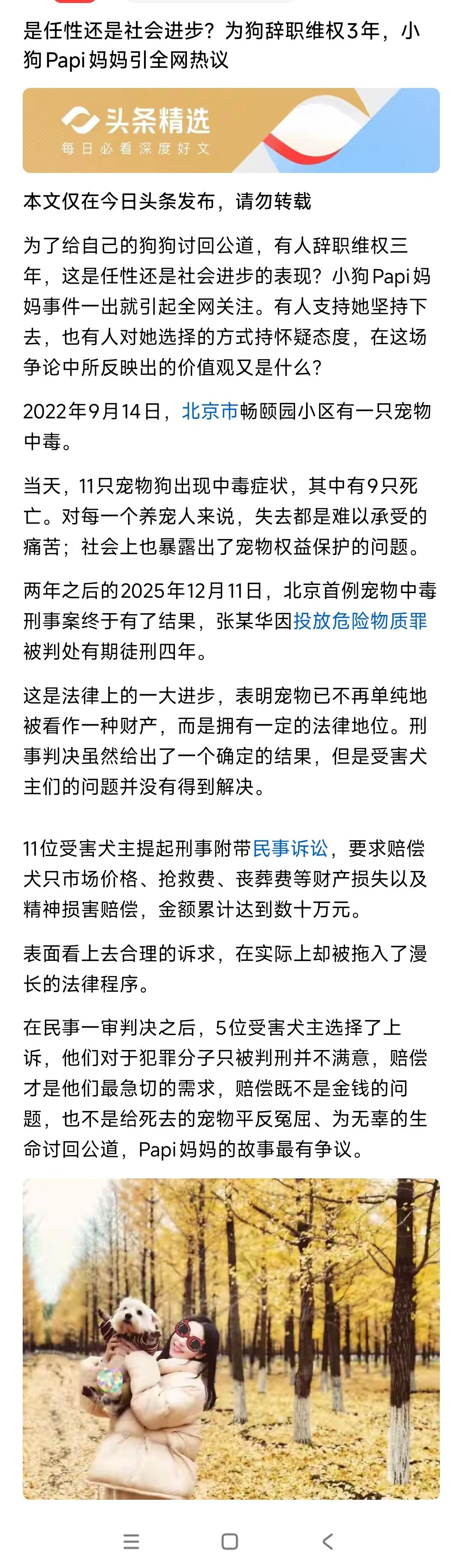 看这新闻,小狗女主,为狗辞职维权3年,是任性还是社会进步?有俩疑问? 一个:不知道她的父母生病需要她陪护时,她是否会辞职? 另一个:她辞职三年靠什么生活,有什么组织给她提供了帮助吗? 一搜,嚯,NGO组织成员,目的借动保搞颜色 当狗权大过人权,不只是病态!一定要睁大眼晴,严防不怀好意的组织在这方面发力,破坏我国的社会生态