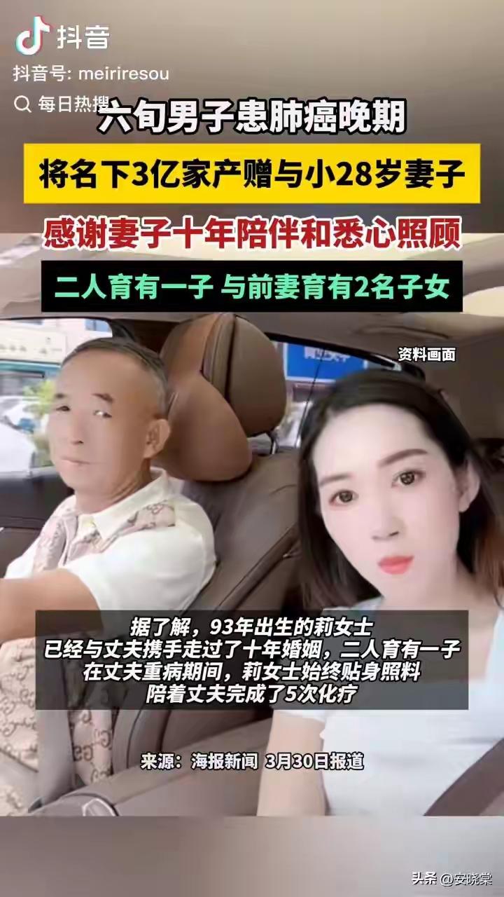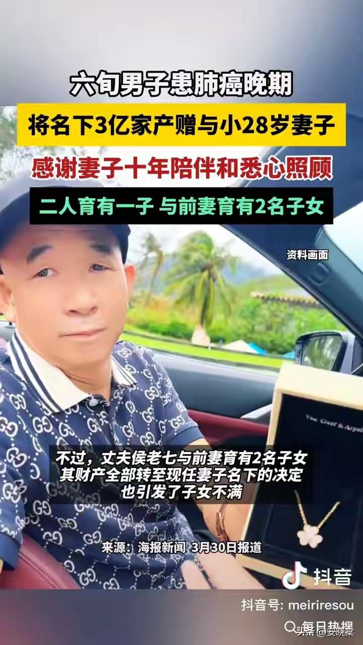 三亚六旬肺癌富豪临终赠3亿家产予小28岁娇妻,十年冷暖相伴惹哭全网,前妻子女怒斥不公引爆遗产大战! 当爱情跨越年龄的鸿沟,是真情还是算计?三亚六旬富商侯老七在肺癌晚期之际,毅然将名下3亿资产全数赠予小28岁的妻子莉女士。这一决定如巨石投湖,瞬间激起千层浪。十年婚姻,一场重病,巨额财富的归属撕开了人性最复杂的面纱。 消息一出,网友瞬间炸锅。有人感叹:“五次化疗不离不弃,这情分值三个亿!”也有人冷笑:“22岁嫁50岁,如今终于熬出头了。”财富与情感的天平上,每个人都在重新掂量“值得”二字。而侯老七与前妻所生的两名子女,已公开表达不满。家庭暗涌,一触即发。 回溯这段婚姻,莉女士22岁嫁给当时50岁的侯老七,一度被贴上“拜金”标签。但十年间,她陪丈夫白手起家度过破产危机,又在肺癌确诊后贴身照料,五次化疗全程守护。丈夫病榻前那句“我的钱只想留给她”,成了最戳心的告白。情感的真伪,时间才是终极裁判。 法律层面,遗嘱继承优先于法定继承。侯老七在意识清醒时完成赠与手续,程序合法。子女虽为法定继承人,却难撼动这份临终嘱托。有律师分析:“若遗嘱真实有效,子女几无翻盘可能。”这场财富转移,不仅是情感选择,更是一场严谨的法律行动。 而莉女士面对争议,只轻声回应:“从未主动要过一分钱,余生只想他好好活着。”十年青春,一场大病,她握着丈夫的手走过生死边缘。在金钱与生命的较量中,她似乎早已做出选择。但旁观者仍在追问:若侯老七一贫如洗,这段婚姻是否依然坚固? 更值得深思的是,这场遗产风波照见了多少家庭暗伤。前妻子女的不满,何尝不是对父爱缺失的控诉?巨额财富放大了亲情裂缝,也让我们看到:有些遗憾,是金钱永远无法弥合的。而侯老七的选择,或许正是对当下陪伴最彻底的偿还。 如今,3亿资产已转入莉女士名下。她说会继续照顾丈夫直到最后一刻。这场跨越28岁的婚姻,终以最残酷的方式接受全民审视。我们无法窥见关起门后的温情,却在这桩新闻里看见爱情、金钱、亲情交织的现代寓言。 当生命进入倒计时,什么才是最珍贵的遗产?侯老七用3亿写下答案,而答案背后的温度,只有局中人才懂。这场沸沸扬扬的争论终会平息,但关于爱与代价的思考,将长久回荡在每一个渴望真情又畏惧现实的人心里。 (来源:综合纵览新闻、海报新闻、大河网等媒体报道) 三亚3亿遗产 忘年恋真相