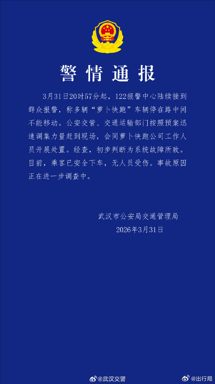 之后武汉交警公布了事故的具体情况,称是“系统故障所致”武汉萝卜快跑集体瘫痪