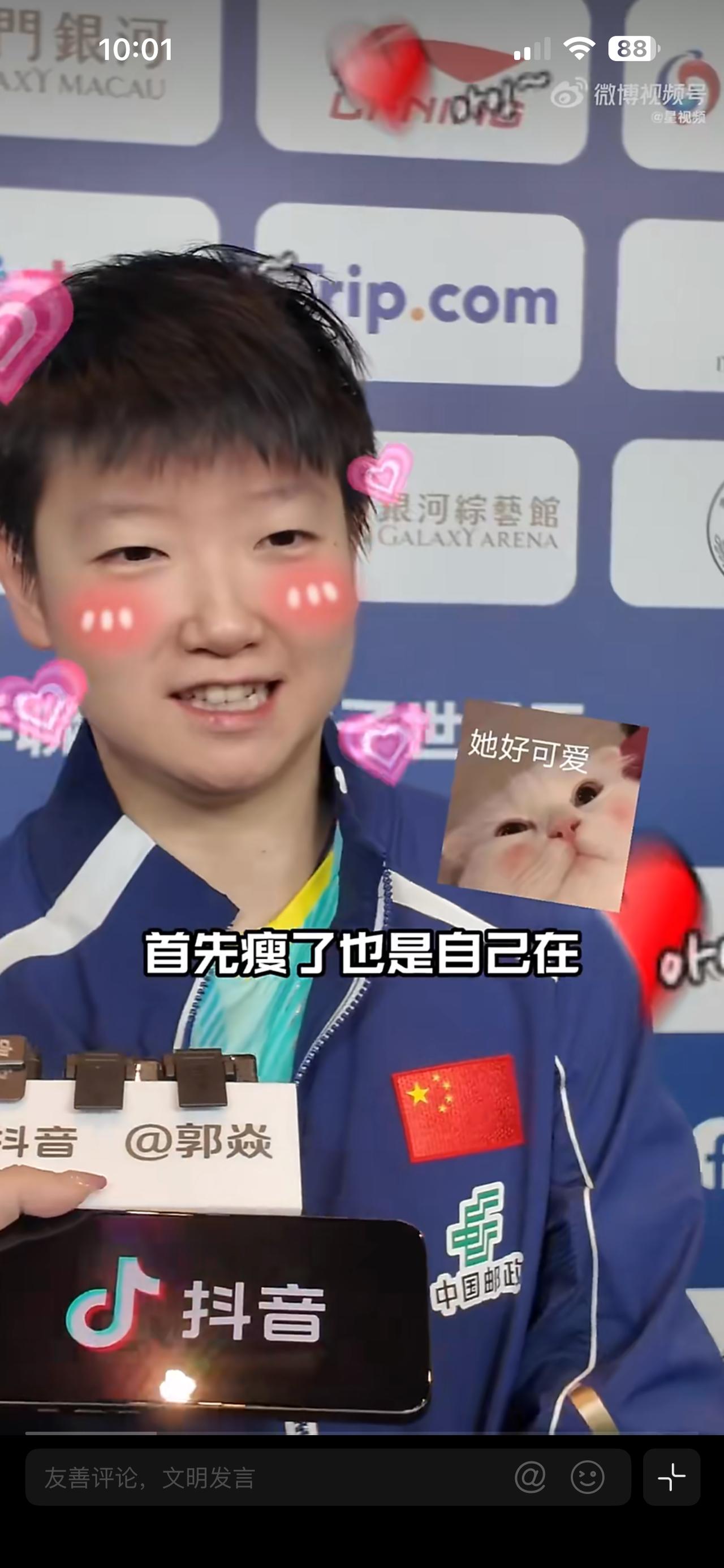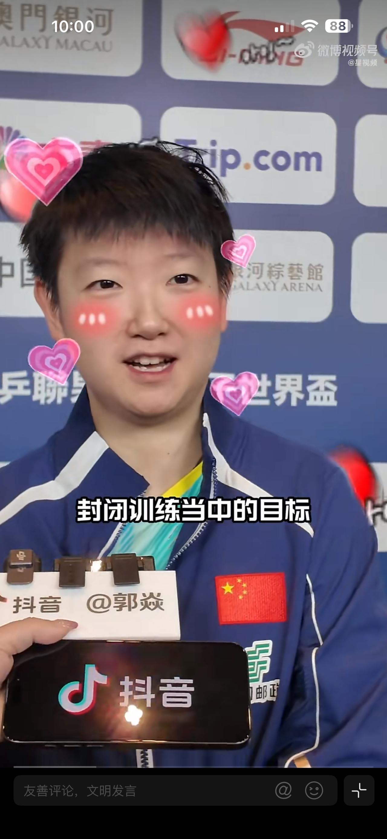 莎莎太逗了😂 接受记者采访时,她说这次封闭训练最大的收获,其实是自己瘦了。说完自己都有点不好意思了,用手撩了撩头发。 莎莎也太有趣了🤩真是个内心朴实的孩子啊。 第一天的比赛,莎莎 3-0 横扫对手,展现出来不错的竞技状态,在去年和前莎莎互得了两次世界杯冠军,今年如果莎莎夺冠,这是第三次夺冠。 给莎莎加油[赞]