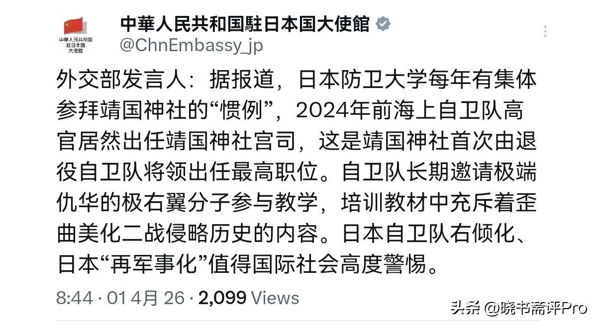 日本还遮遮掩掩,不想正视根本性问题,这一次我们把话挑明了说!4月1日,中国驻日大使馆刊文表示,据报道,日本防卫大学每年有集体参拜靖国神社的“惯例”,2024年前海上自卫队高官居然出任靖国神社宫司,这是靖国神社首次由退役自卫队将领出任最高职位。 自卫队长期邀请极端仇华的极右翼分子参与教学,培训教材中充斥着歪曲美化二战侵略历史的内容。日本自卫队右倾化、日本“再军事化”值得国际社会高度警惕。很显然,我们大使馆这一刊文传递的是什么意思呢?一句话,日本自卫队军官持刀闯馆事件,绝不是什么孤例。 中国驻日大使馆把话挑明,就是不再给日本留任何模糊空间:从防卫大学集体参拜靖国神社,到退役自卫队高官执掌靖国神社,再到自卫队教材公然歪曲历史、邀请反华极右翼授课,一系列事件环环相扣,早已构成一条完整的危险链条。持刀闯馆看起来是偶然事件,但是实则是日本自卫队早已经与军国主义的阴魂深度勾连在了一起。 我们这样的表态,这也是告诉日本,别想着把这一事件当个案处理了,别想着大事化小小事化了,以轻描淡写的以道歉了事。我们心里面门清,日本自卫队意识形态层面出了大问题,管理出了大问题。如果日本不严肃处理此事,日本国内不可测的极端事件还会发生,甚至不排除一线自卫队军官做极端行为,这恐怕会大大提高中日摩擦,甚至擦枪走火的风险。